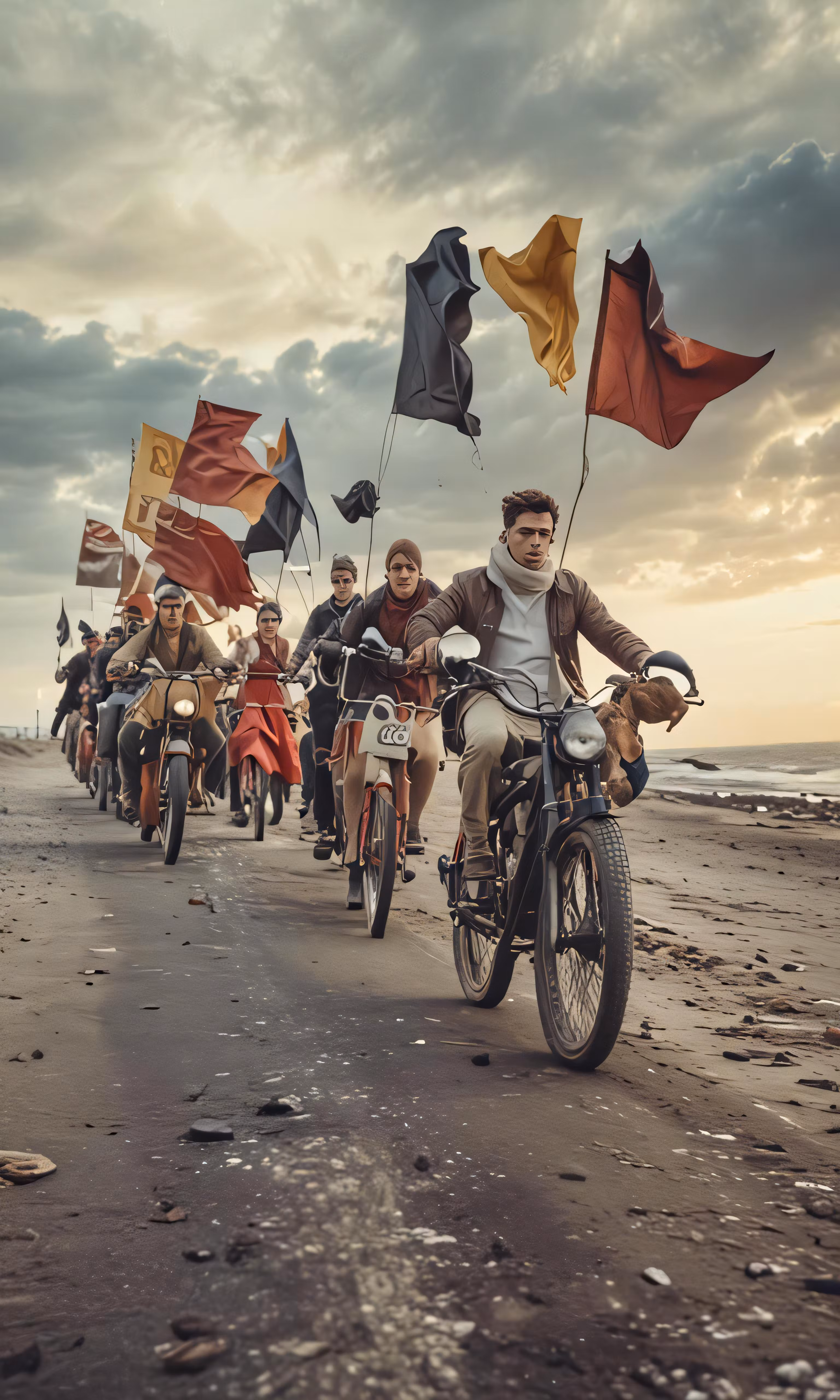 High resolution picture, free to use, a group of people riding bikes on a beach with flags