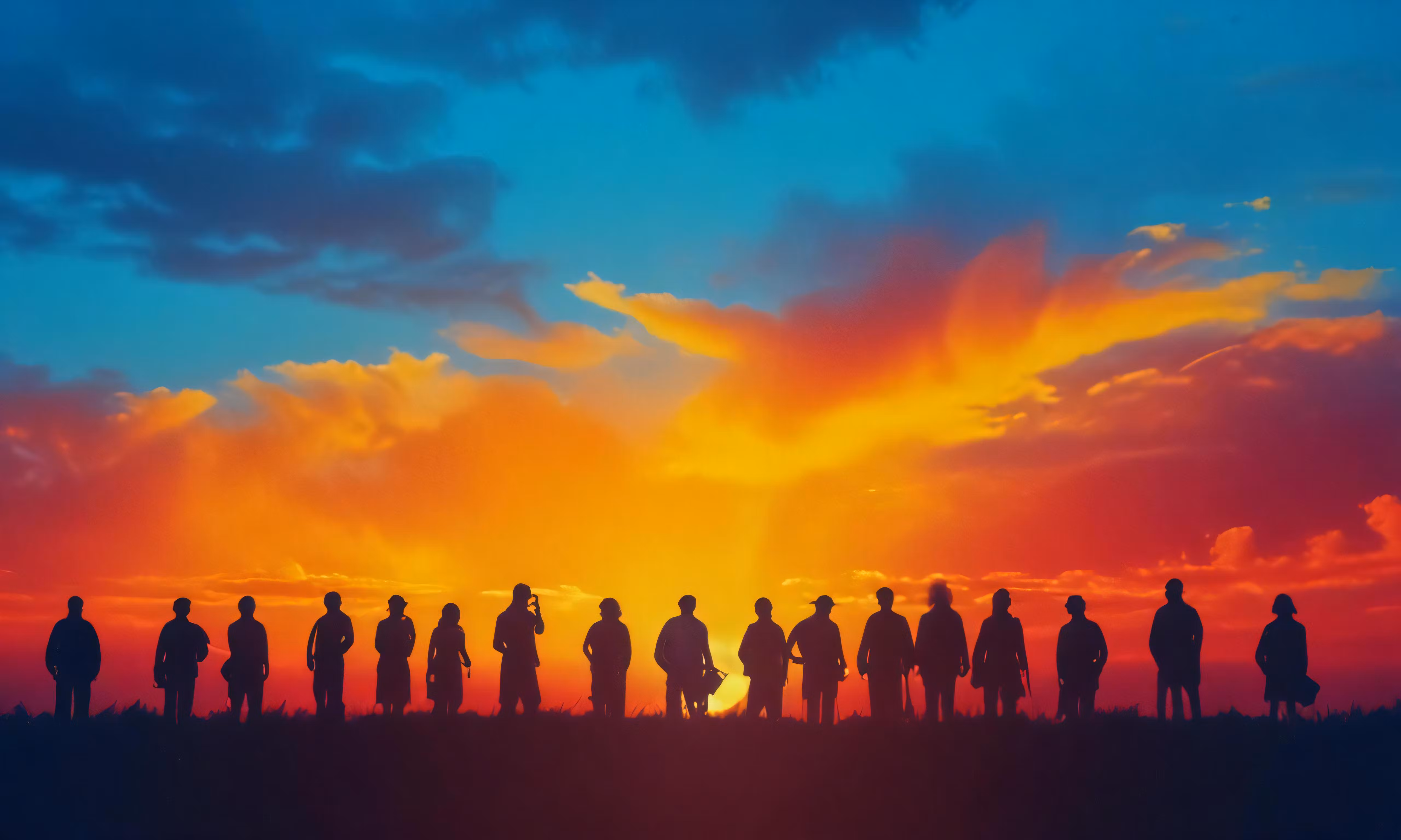 High resolution picture, free to use, a group of people stand in the middle of a sky with the sun coming up