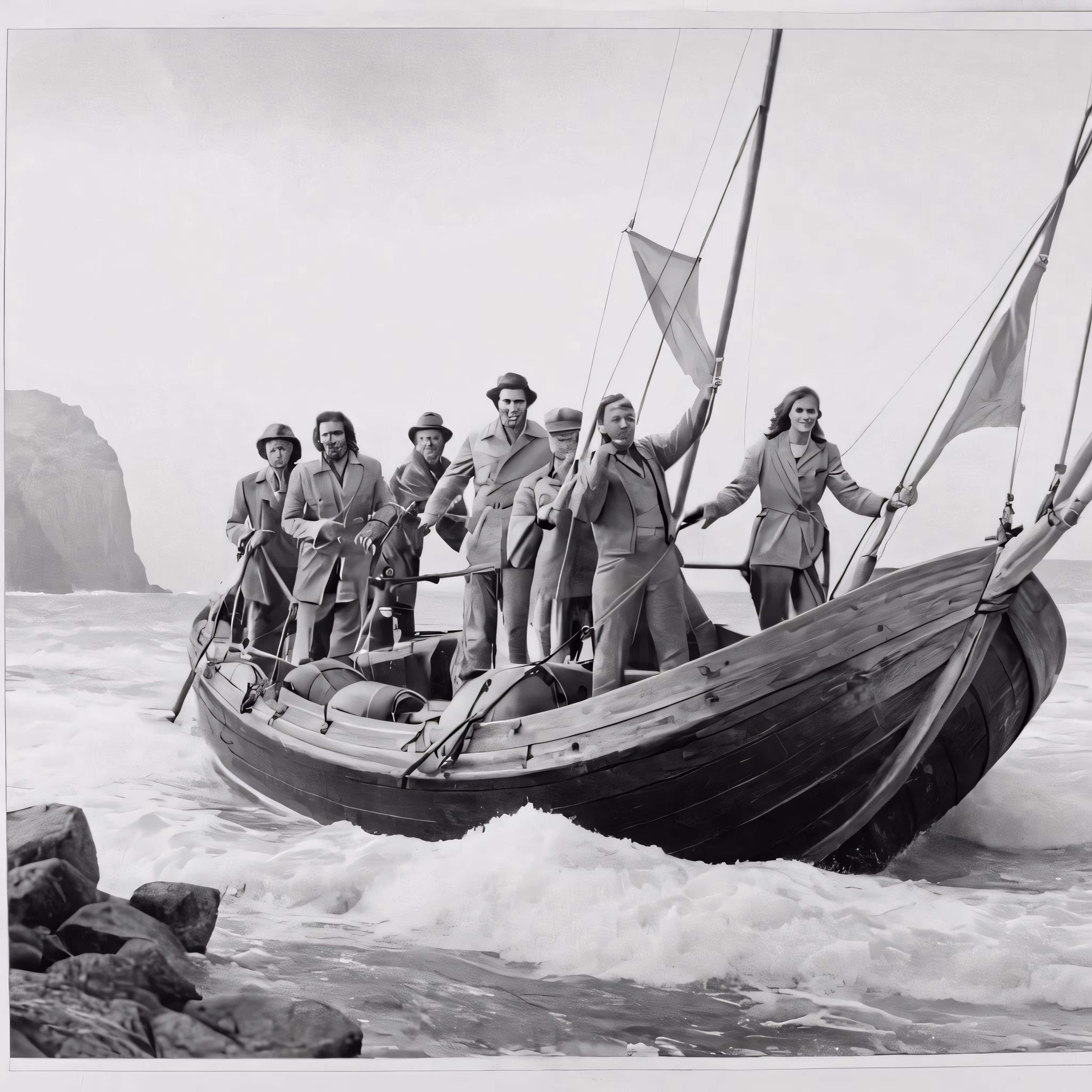 High resolution picture, free to use, a group of people standing on the front of a small boat