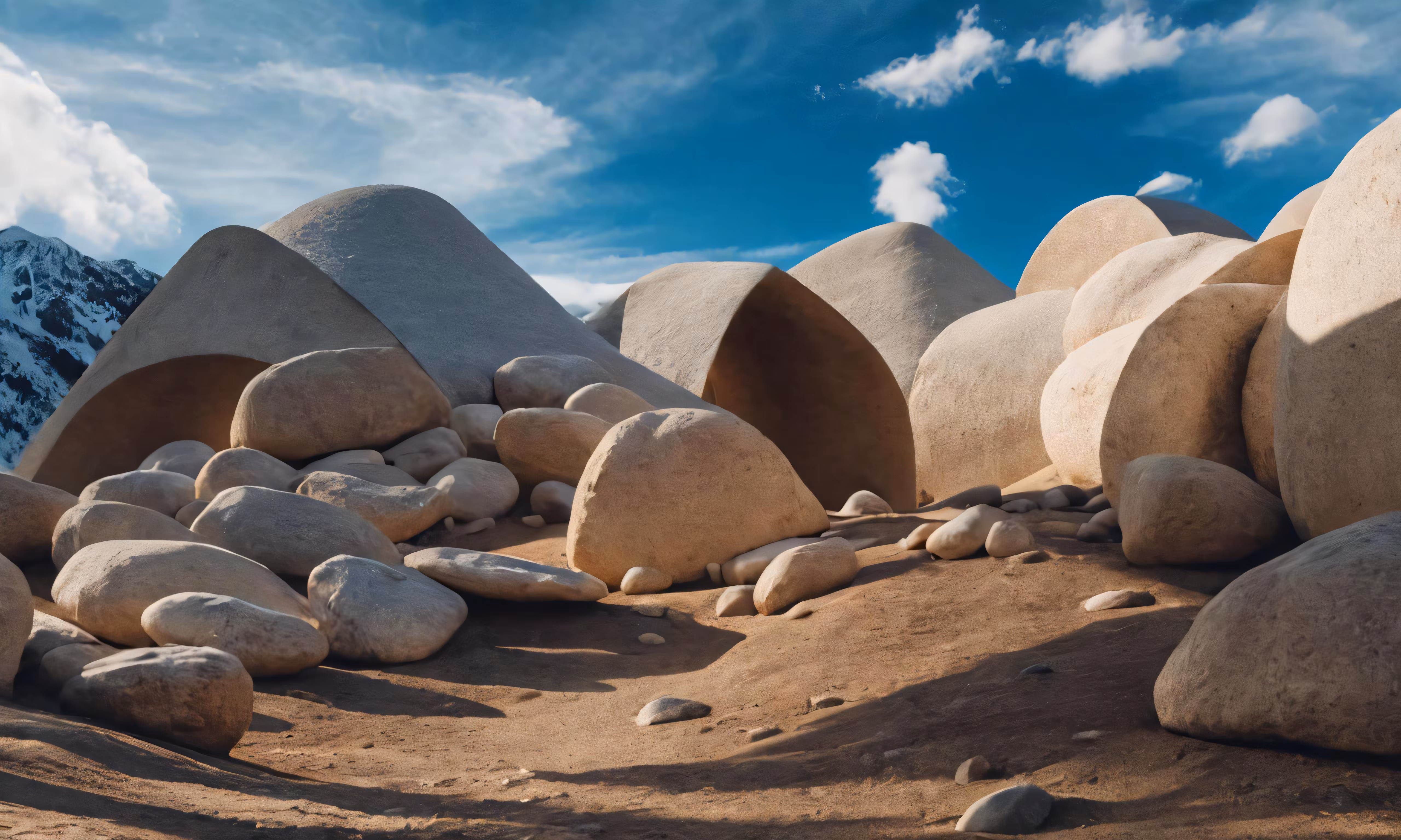 High resolution picture, free to use, a group of rocks on the ground by some snow covered mountains