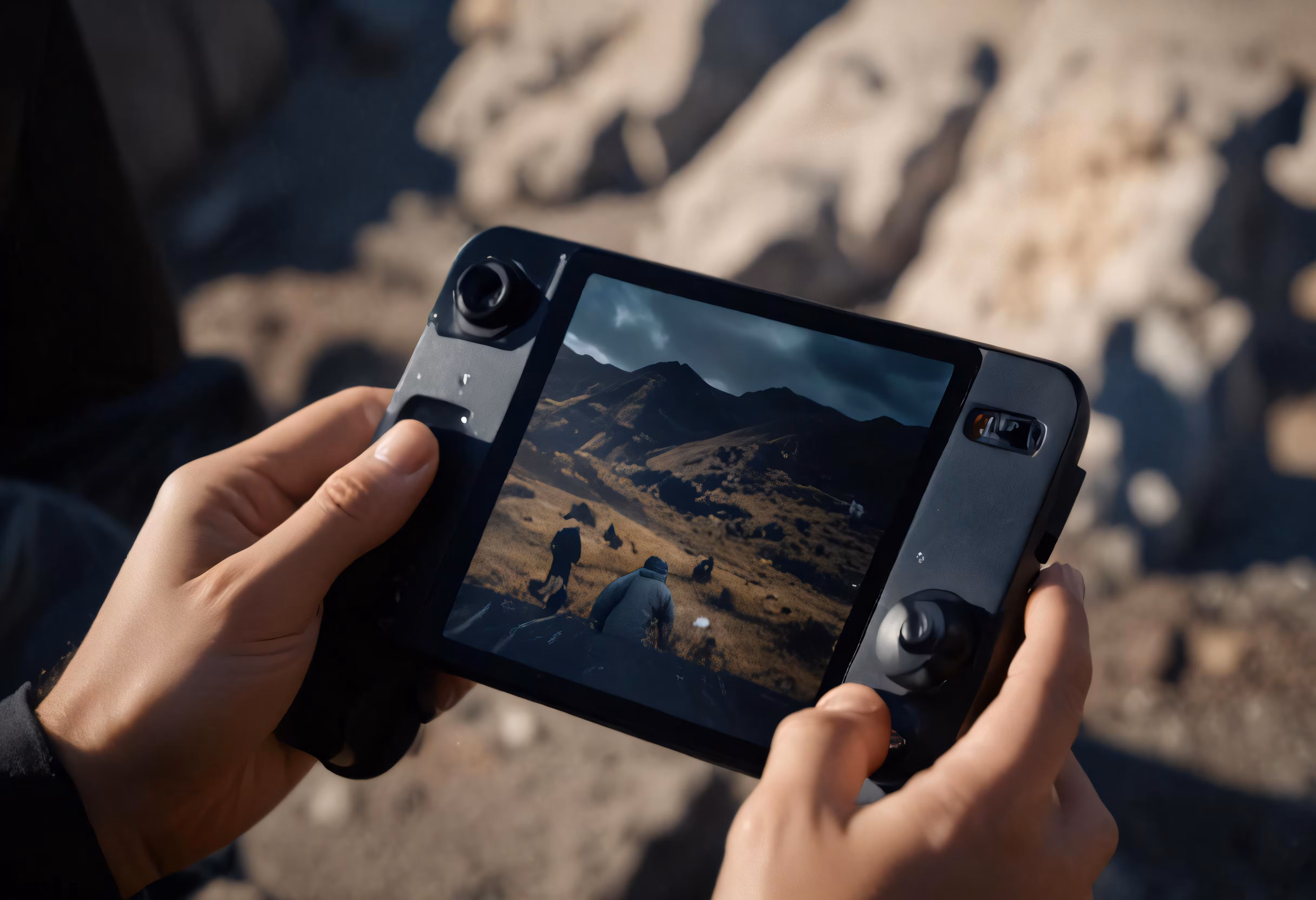 High resolution picture, free to use, a hand is holding a device with the user playing on it