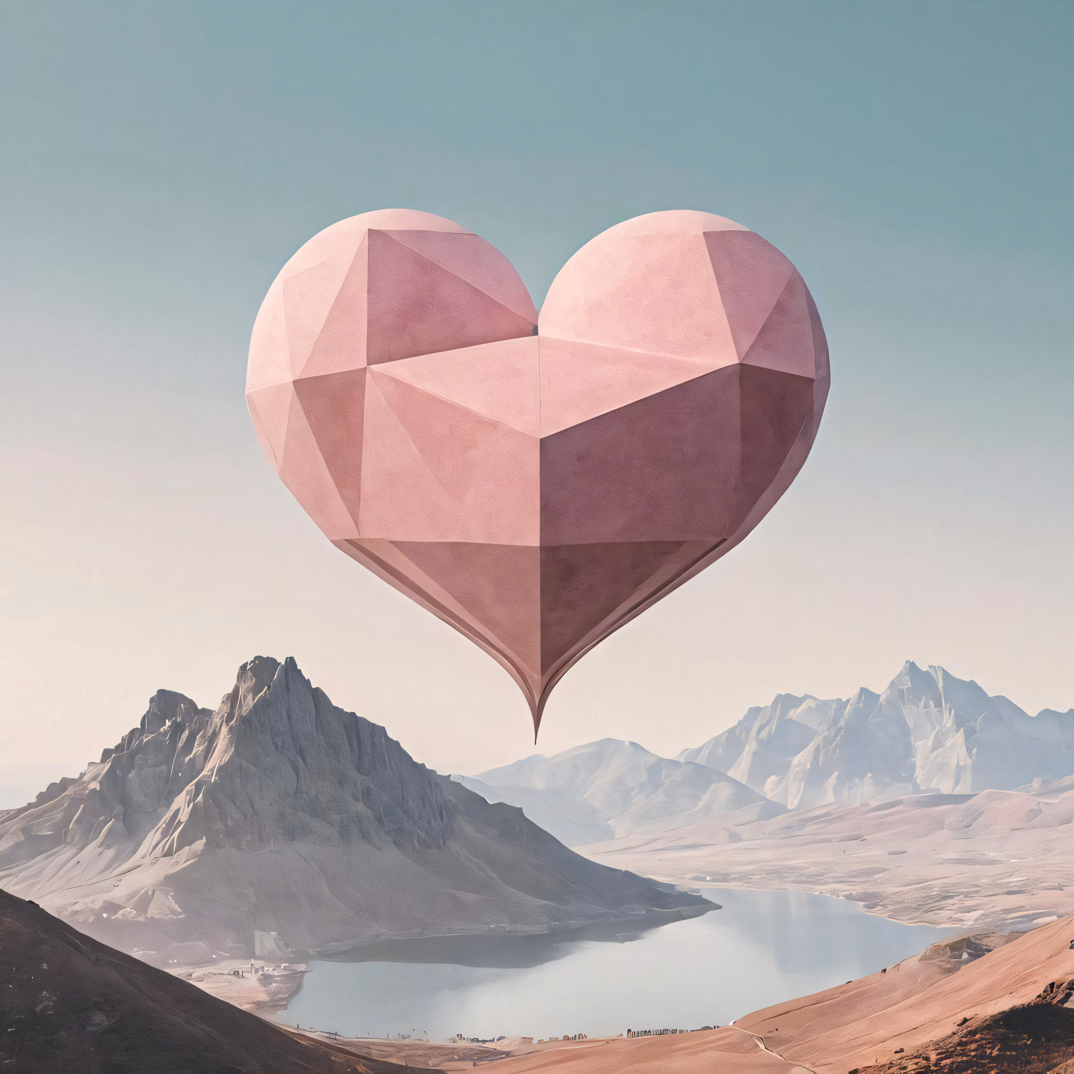 High resolution picture, free to use, a heart shaped balloon flying over mountains and water