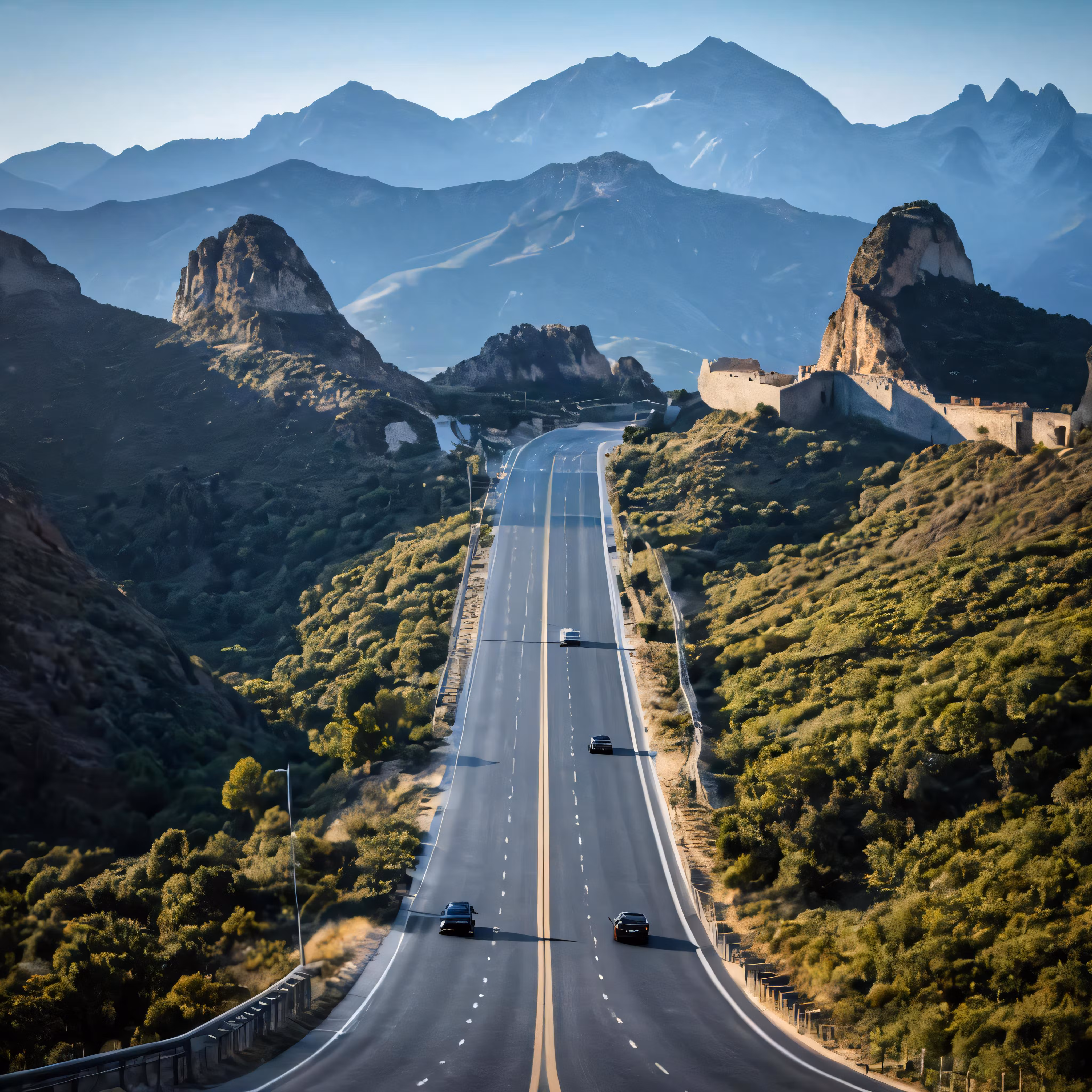 High resolution picture, free to use, a highway in the mountains with trees and bushes on either side