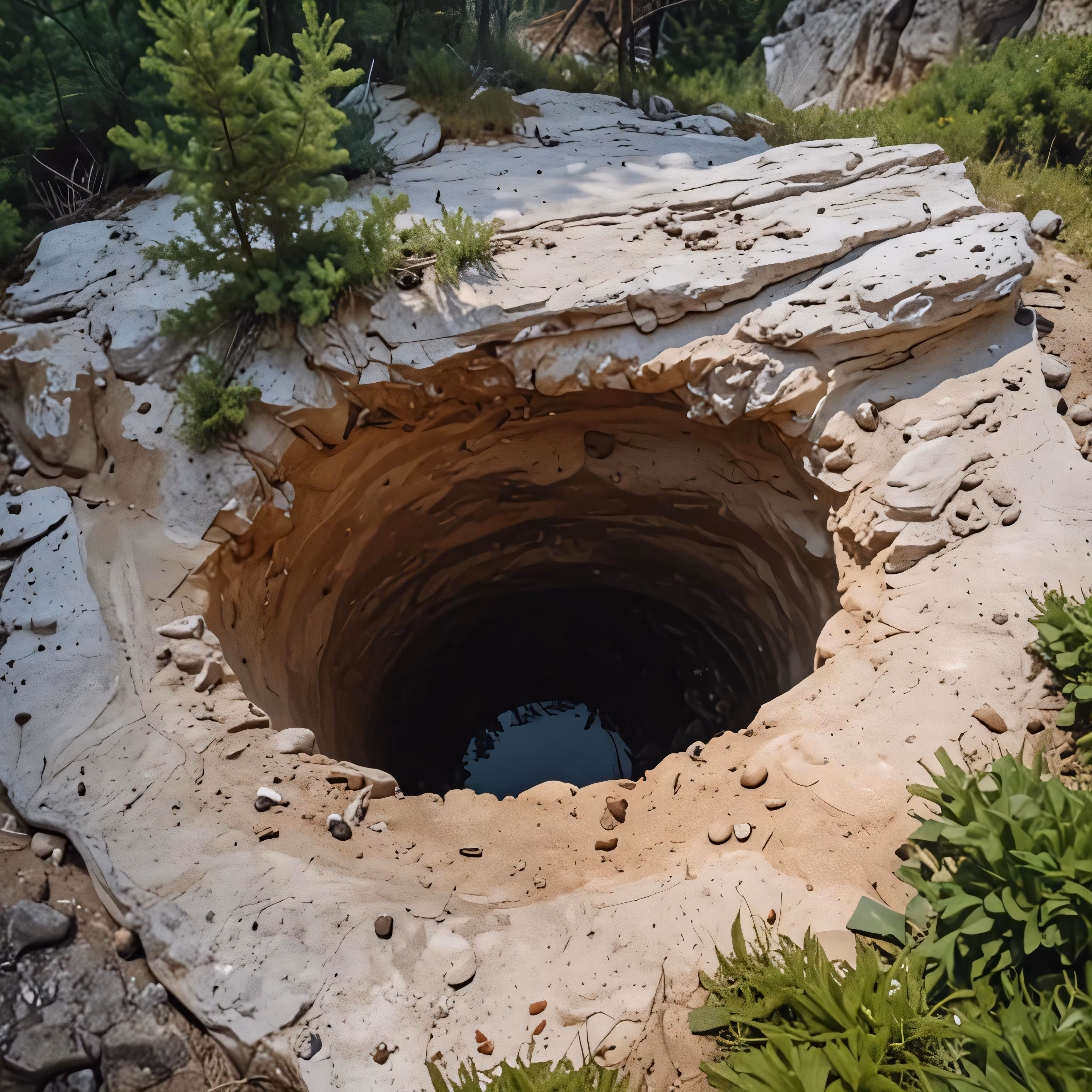 High resolution picture, free to use, a hole in the rocks surrounded by trees and bushes