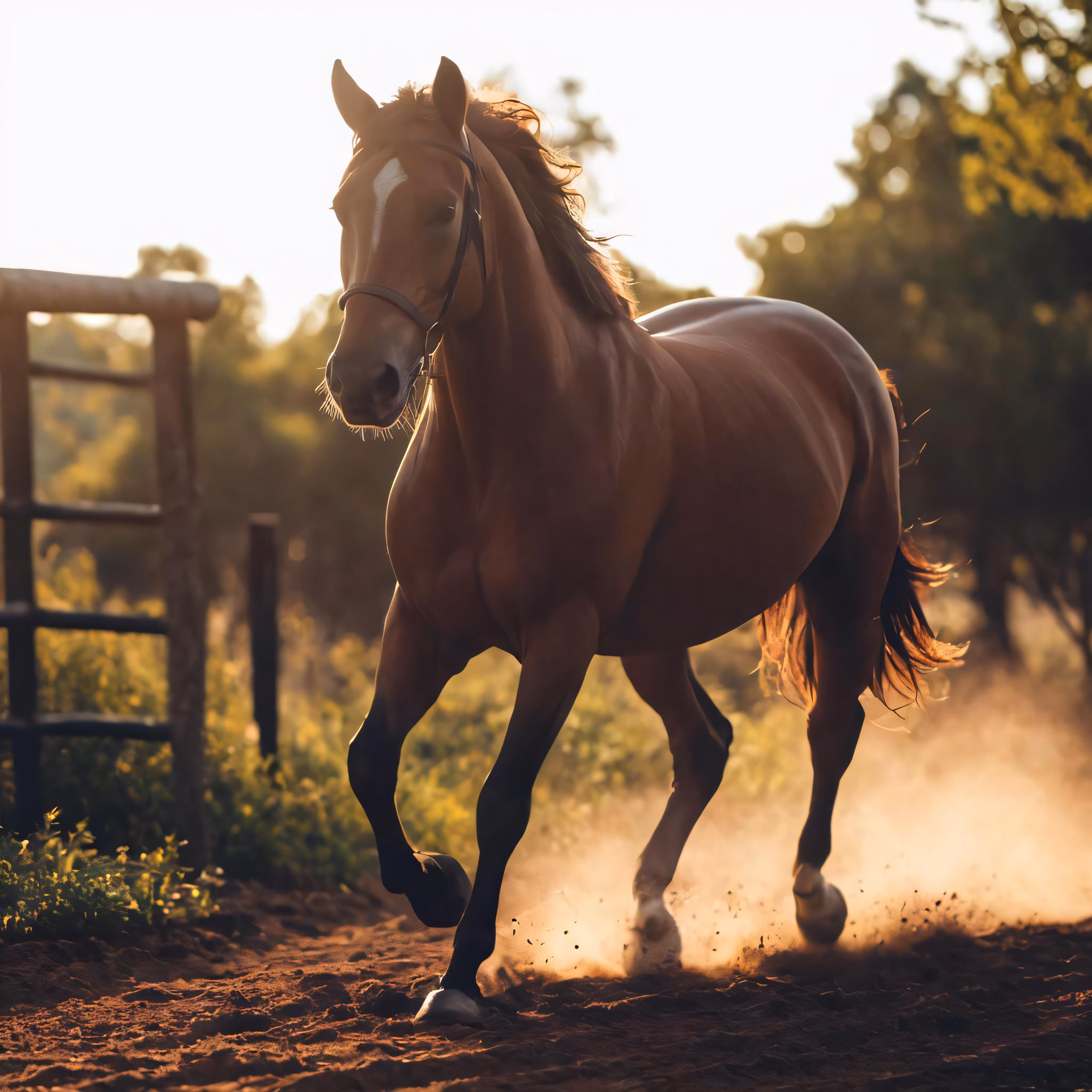 High resolution picture, free to use, a horse is trotting across the dirt near the fence