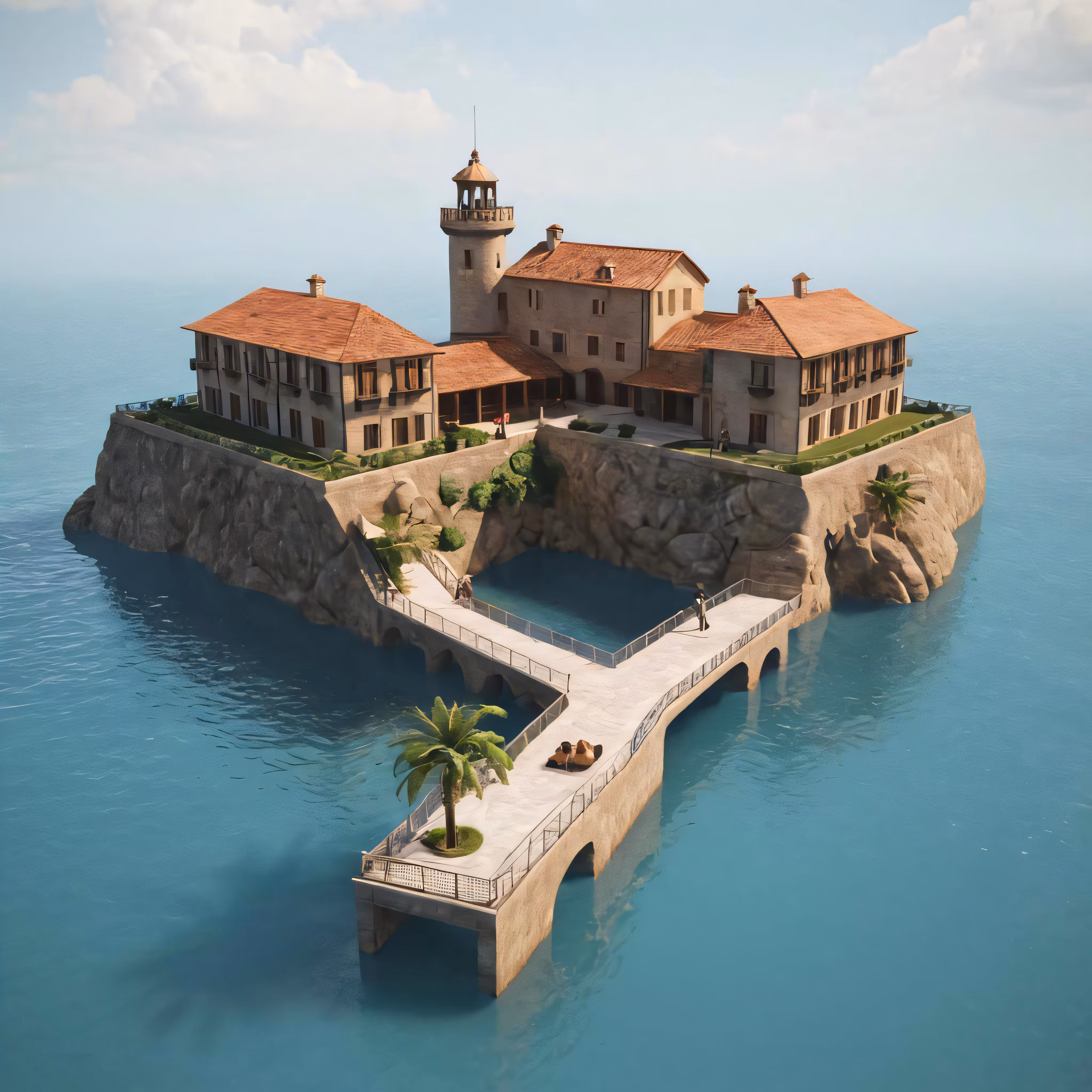 High resolution picture, free to use, a house built on a small island with a stone walkway
