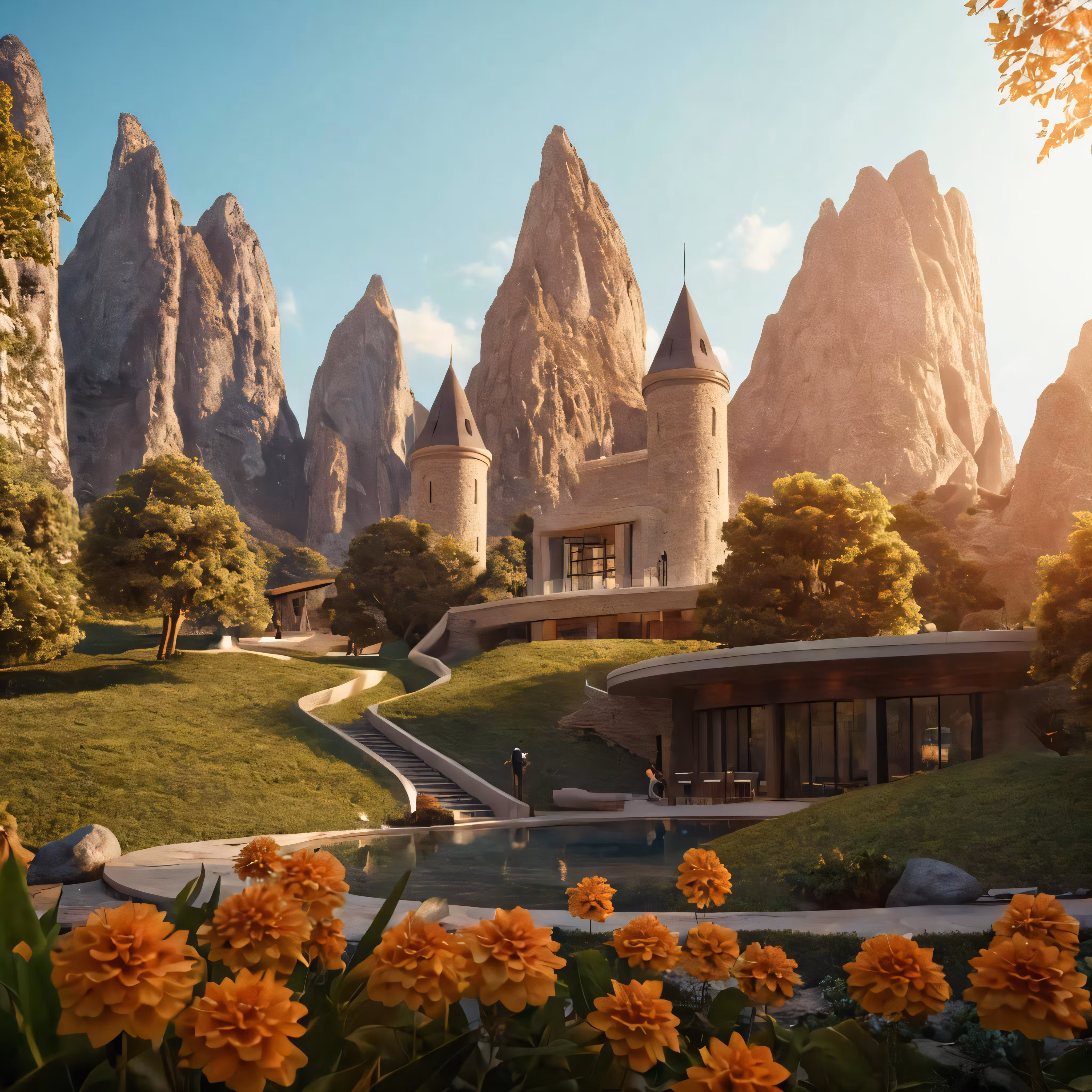 High resolution picture, free to use, a house on a cliff surrounded by mountains