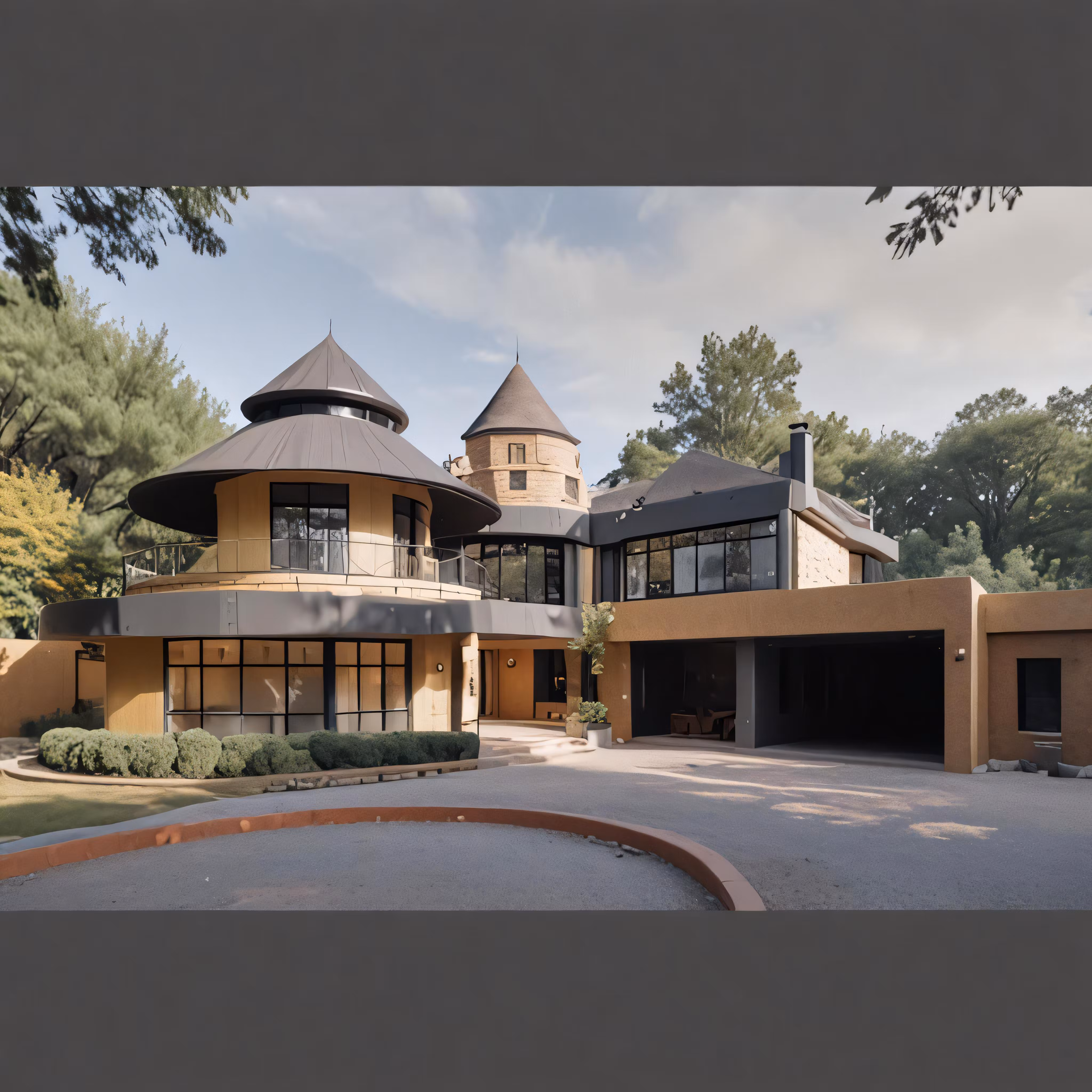 High resolution picture, free to use, a house with large driveway next to a tall building