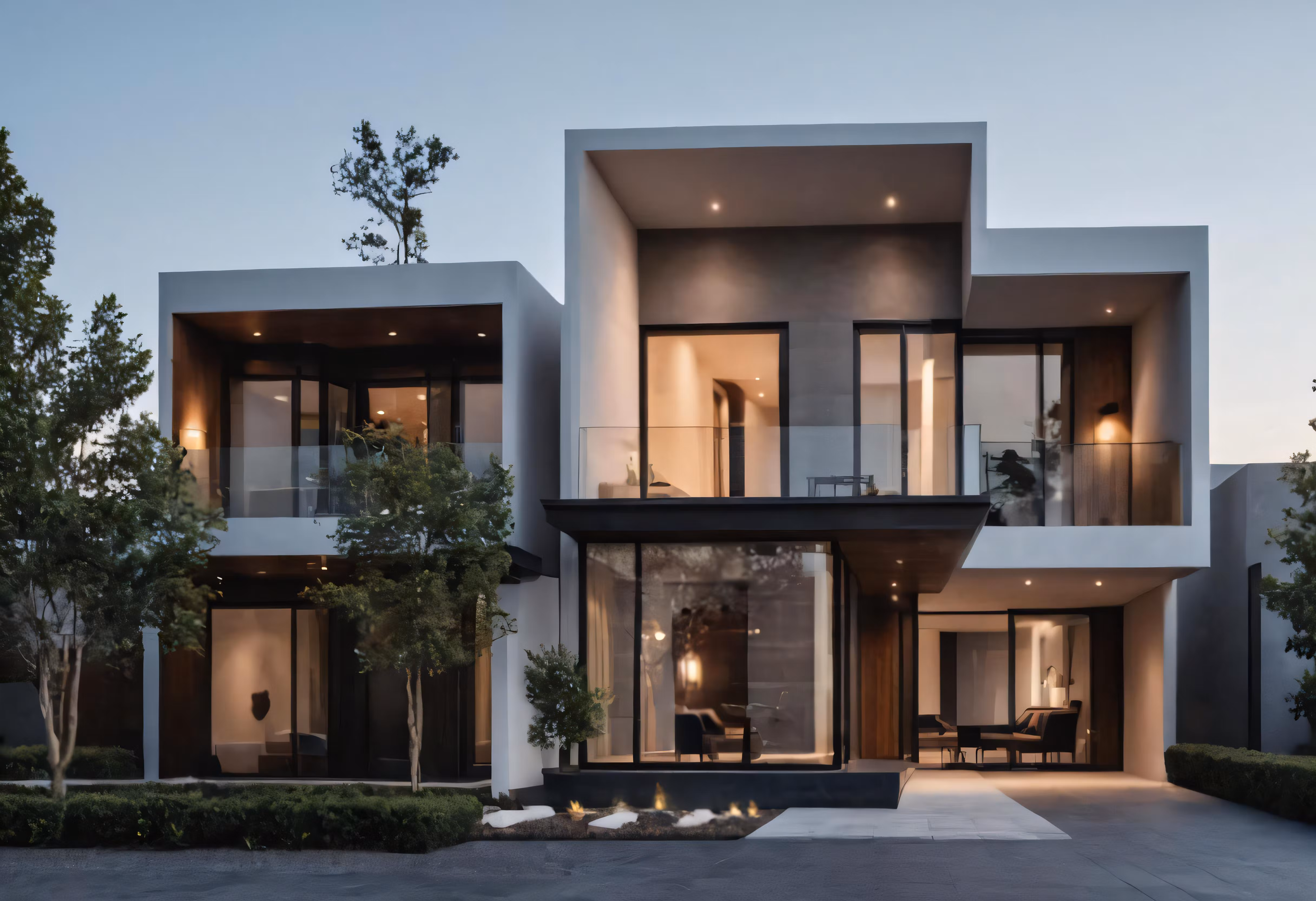 High resolution picture, free to use, a house with large glass windows sitting next to trees
