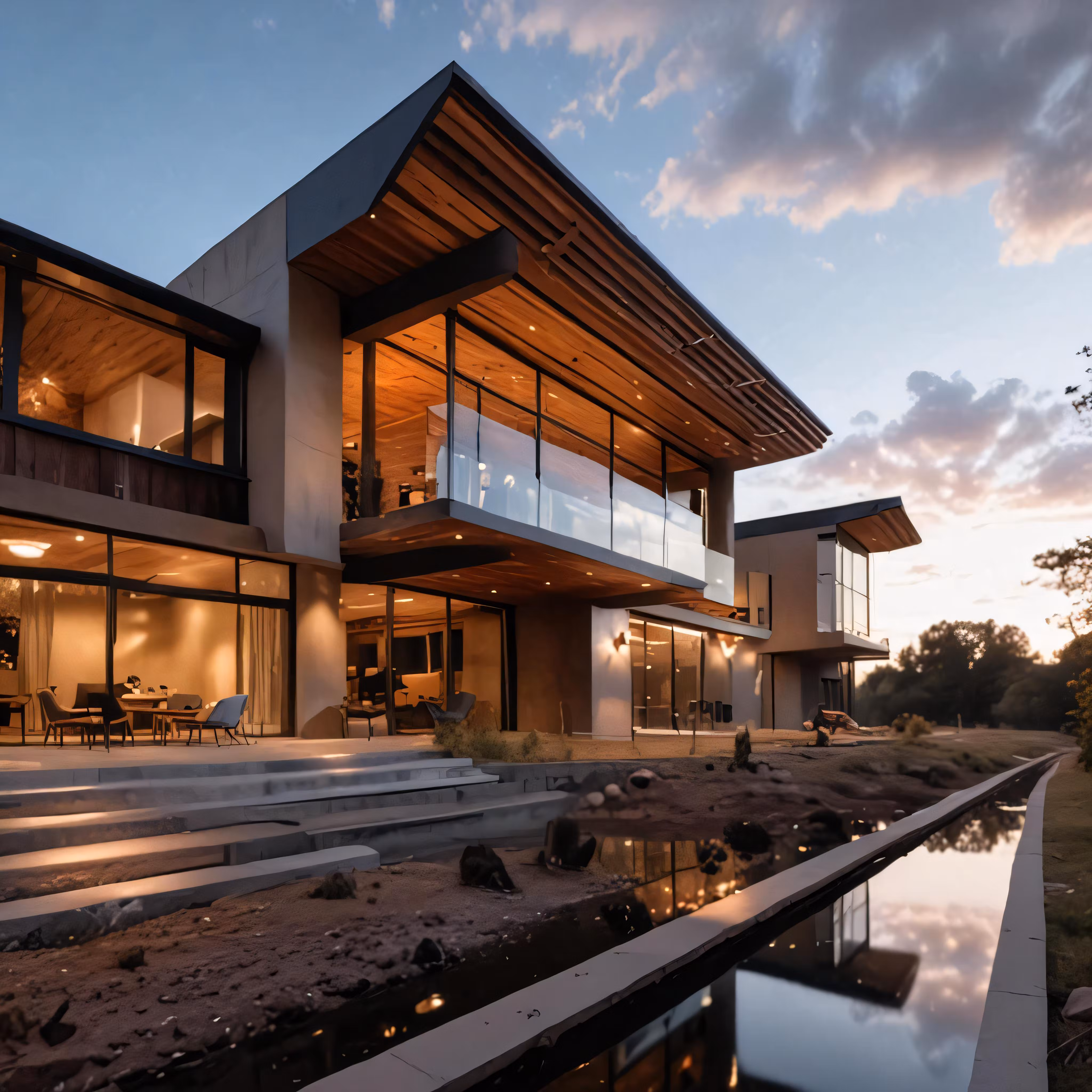High resolution picture, free to use, a house with large glass windows sitting on top of a hillside