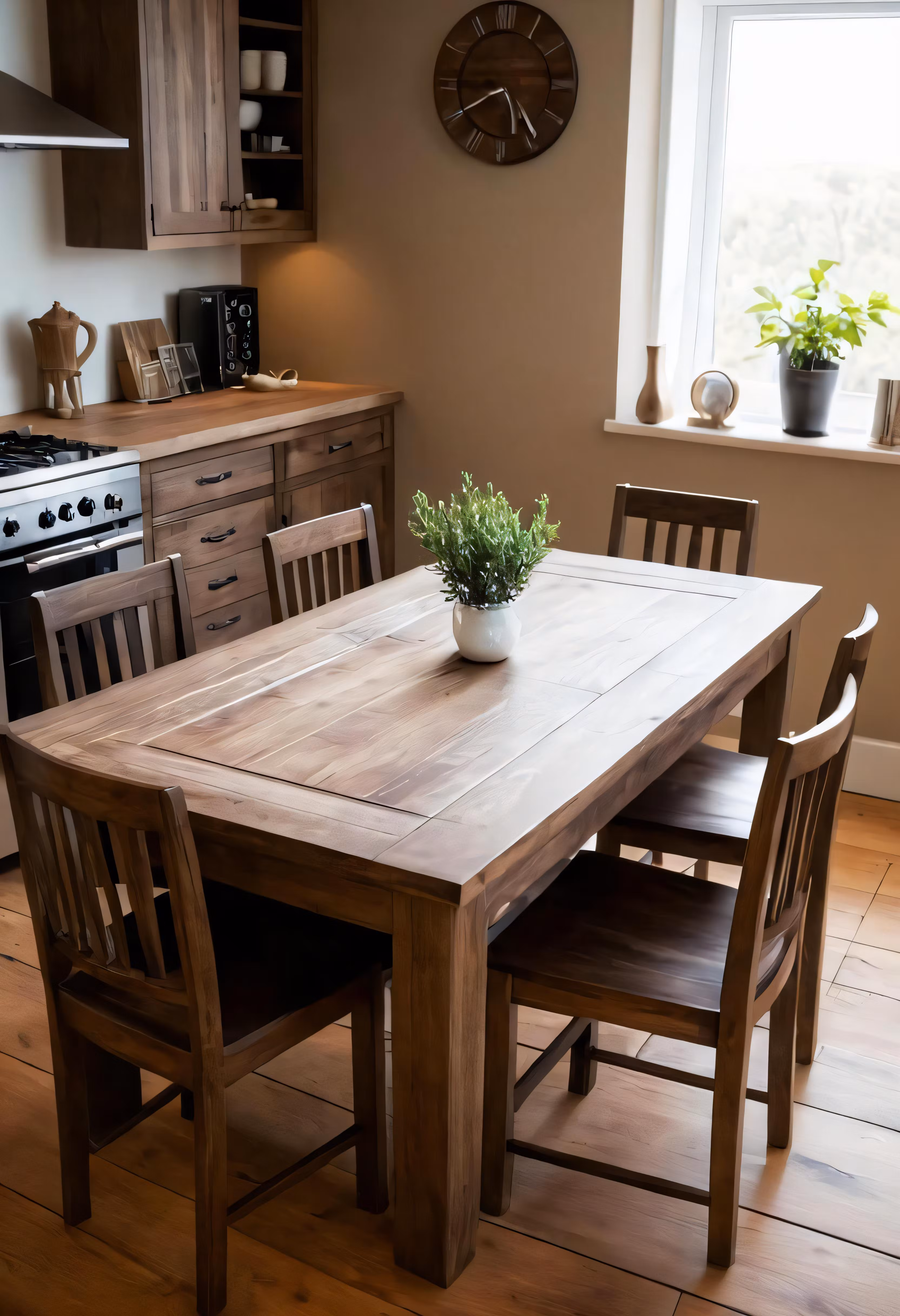 High resolution picture, free to use, a kitchen table with chairs and a clock