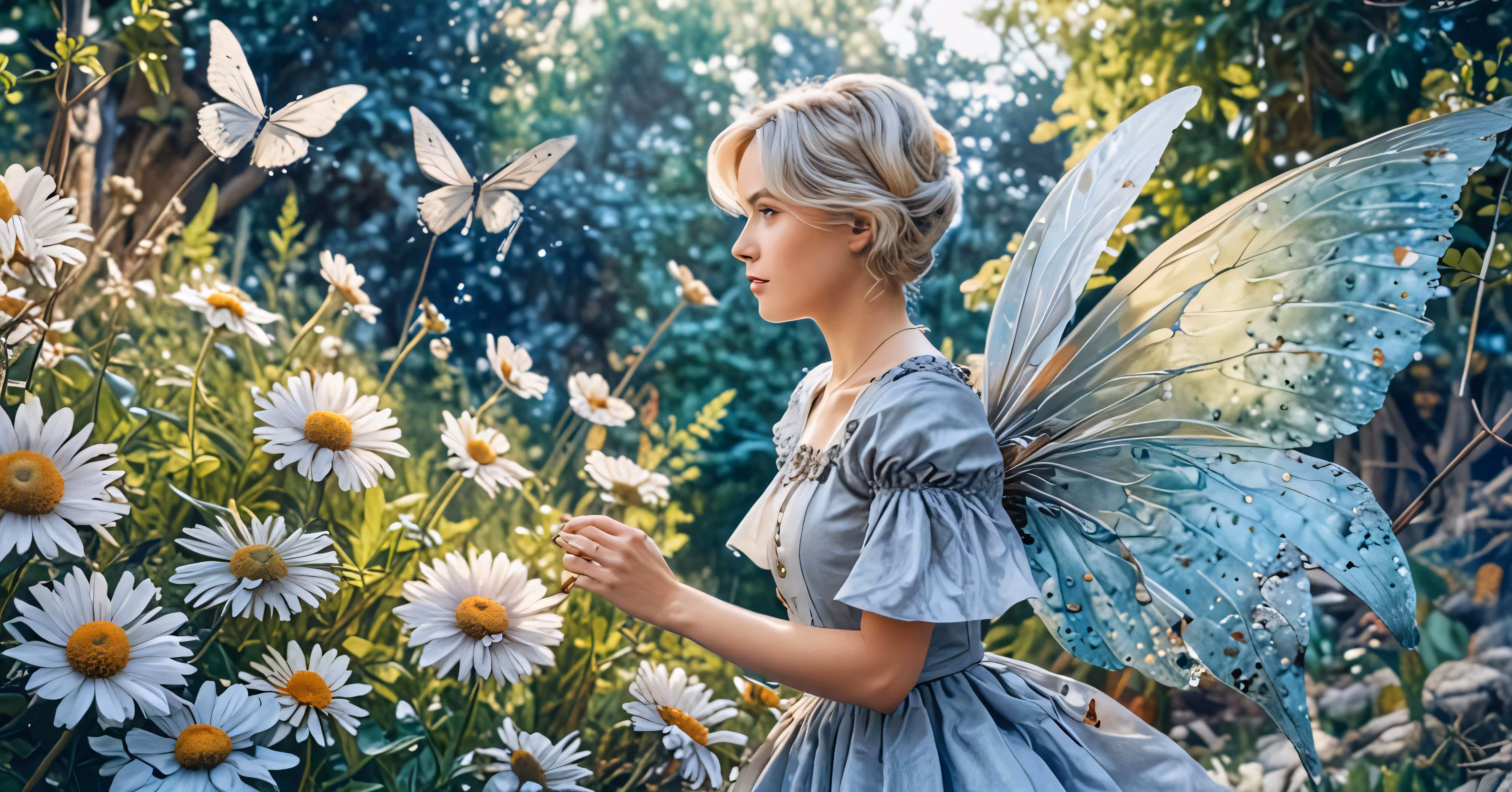 High resolution picture, free to use, a lady with a blue dress and a flower in front of a forest