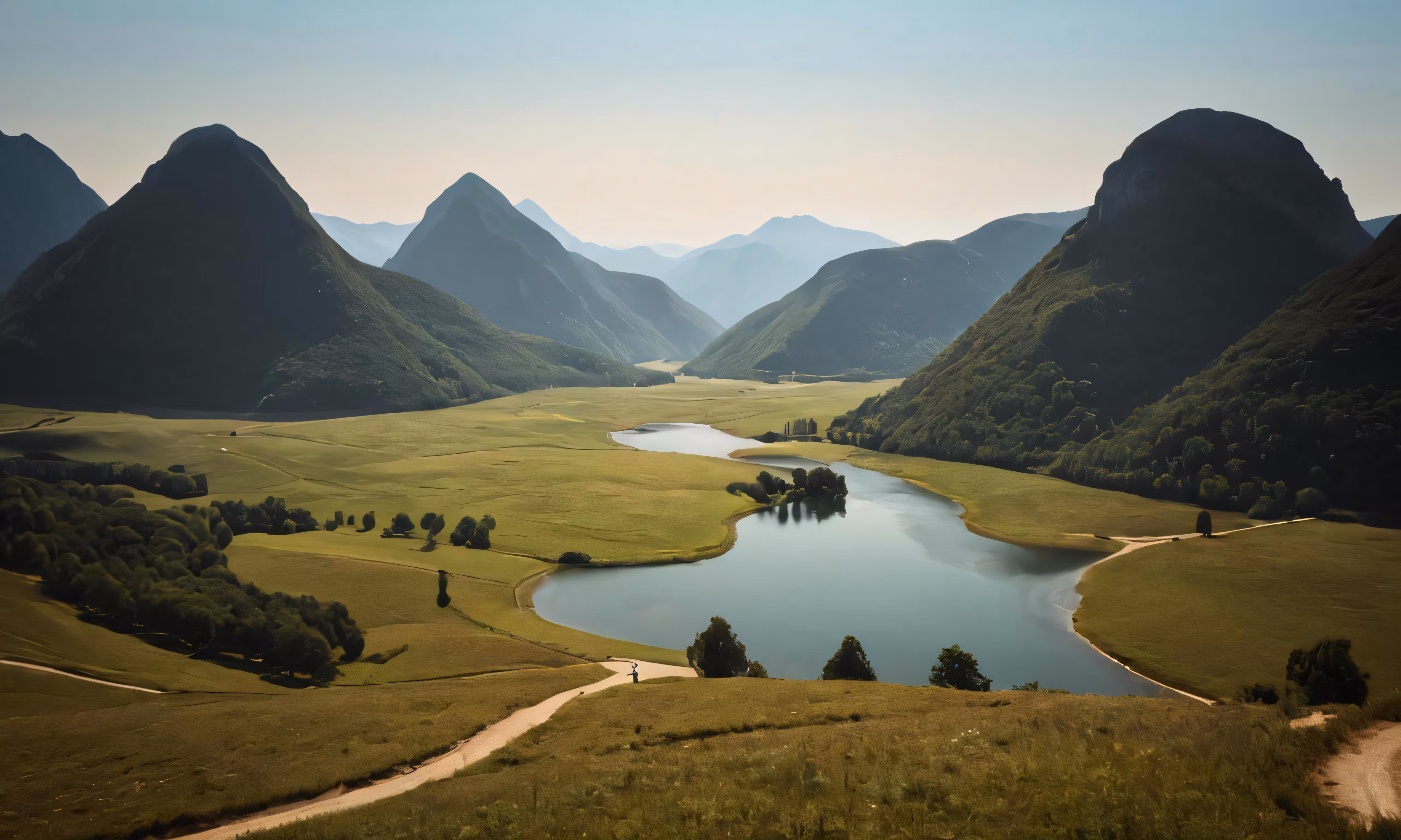 High resolution picture, free to use, a lake surrounded by a lush green hillside