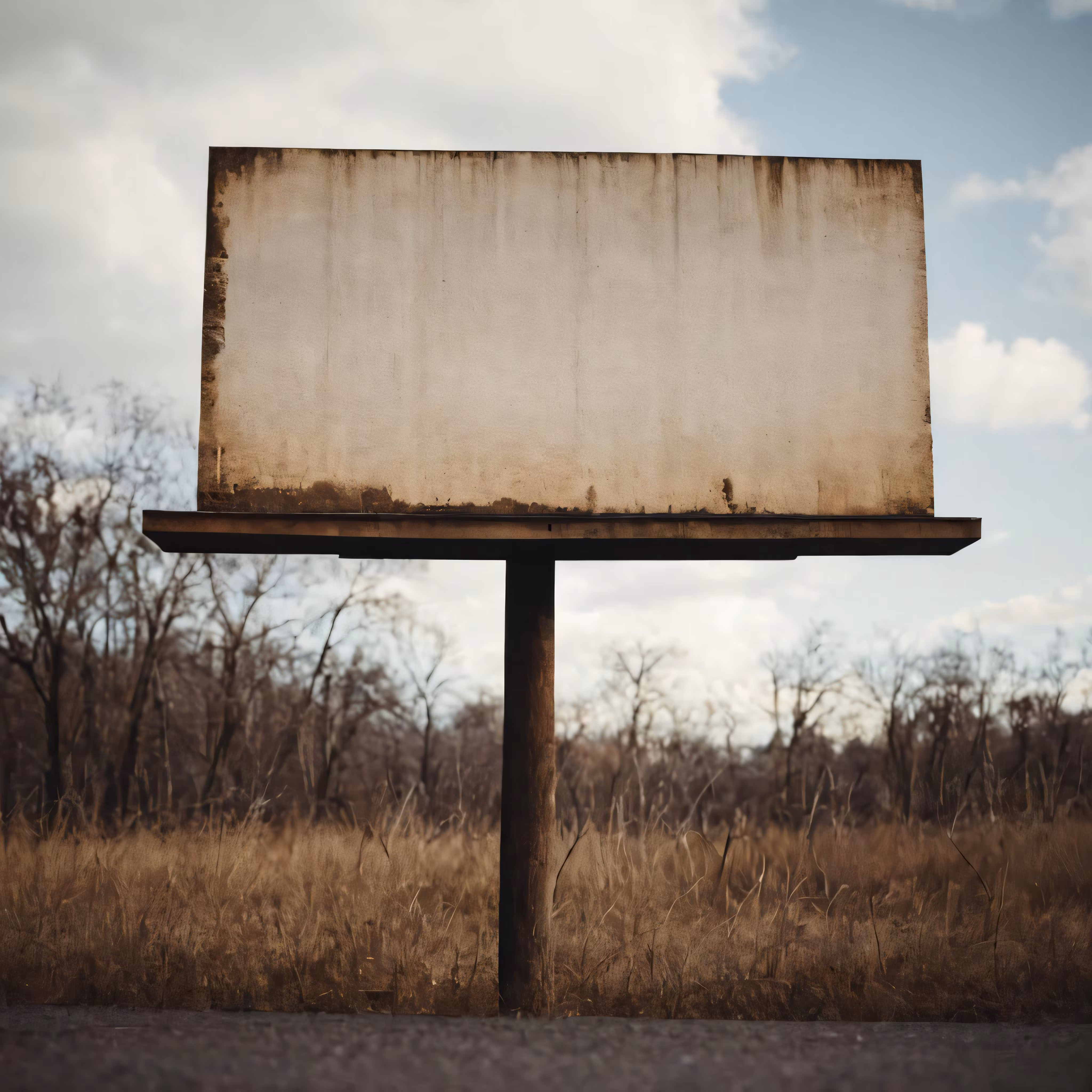 High resolution picture, free to use, a large, faded advertisement is in an open field