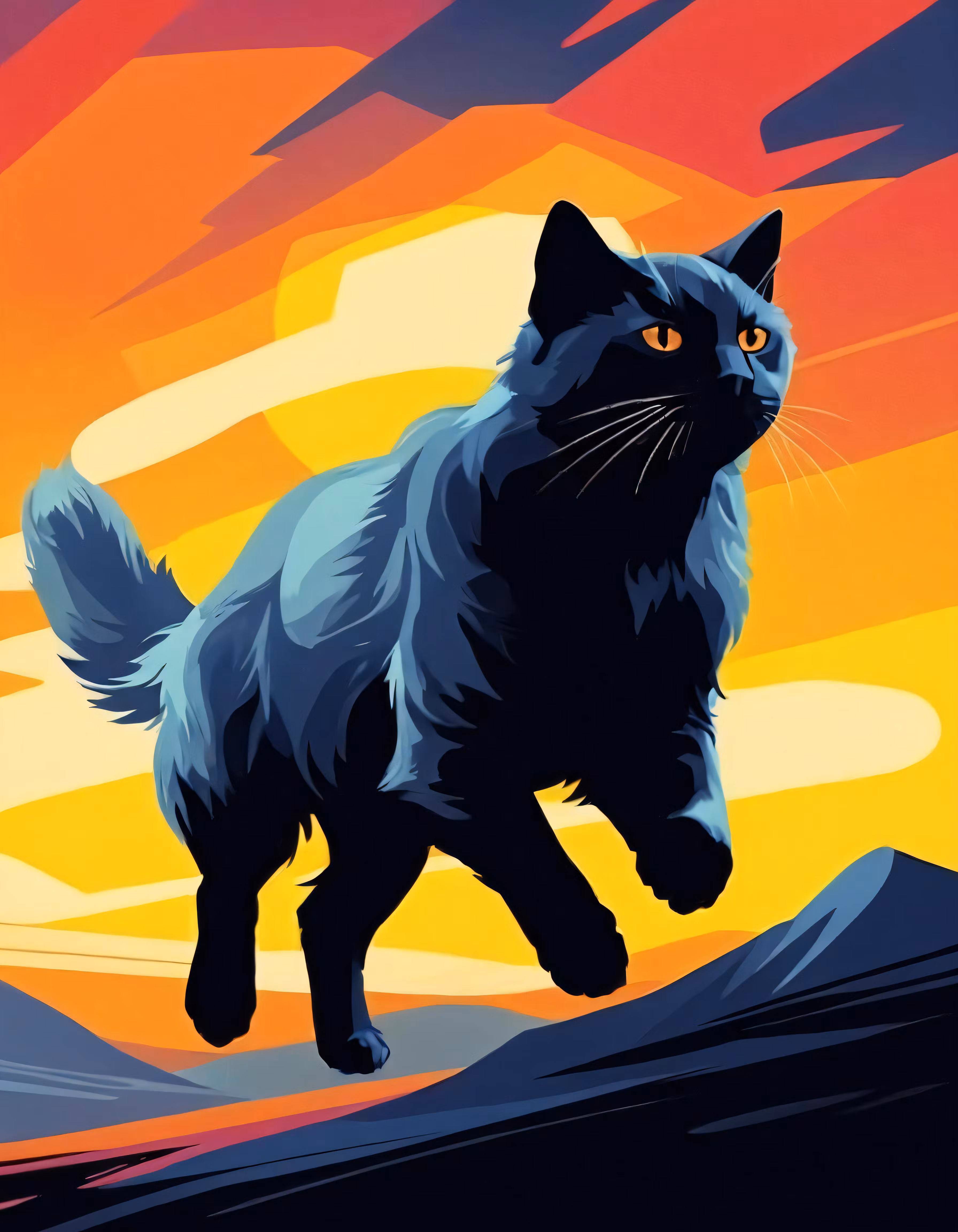 High resolution picture, free to use, a large cat walking across a landscape at sunset