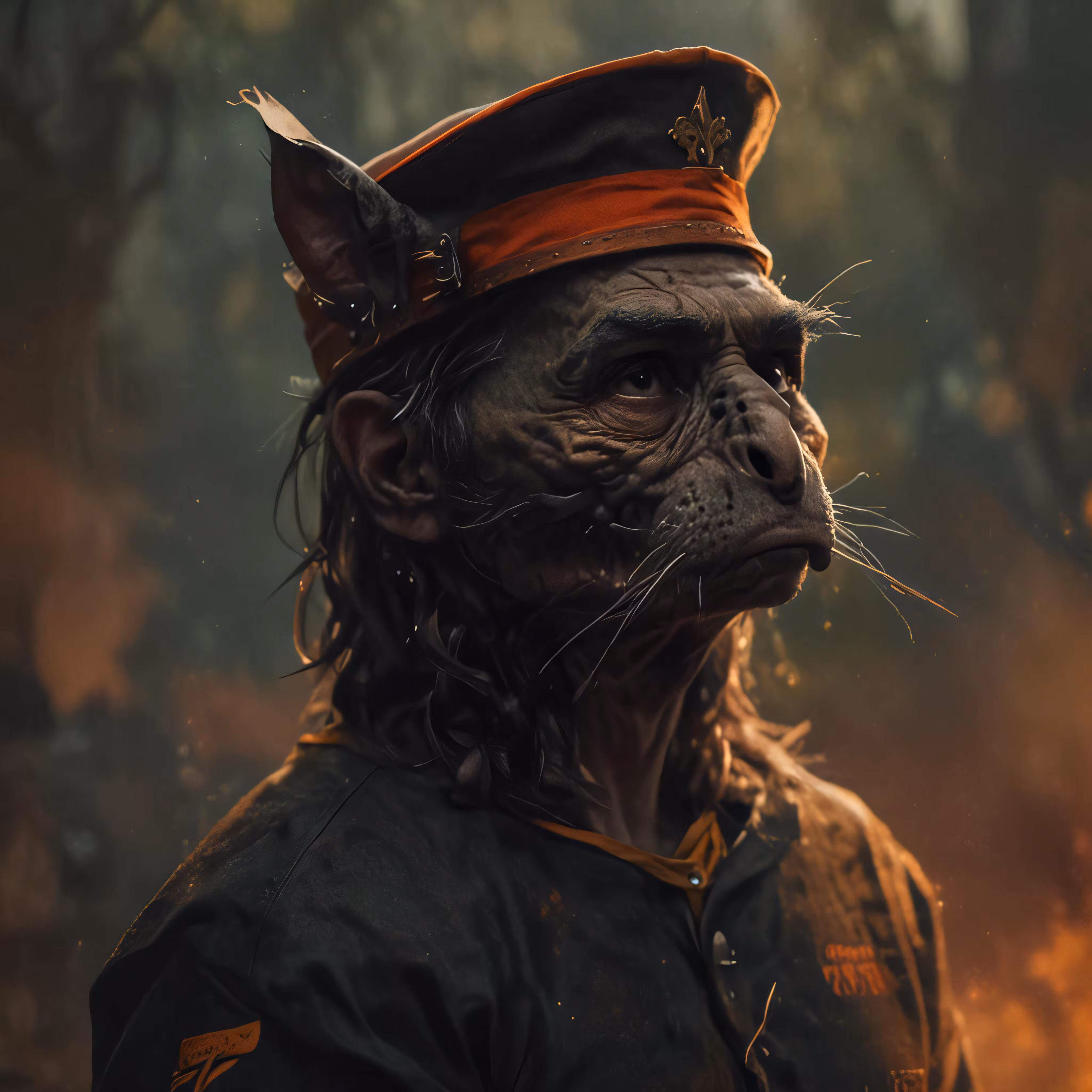 High resolution picture, free to use, a large creature wearing an odd looking hat in the woods
