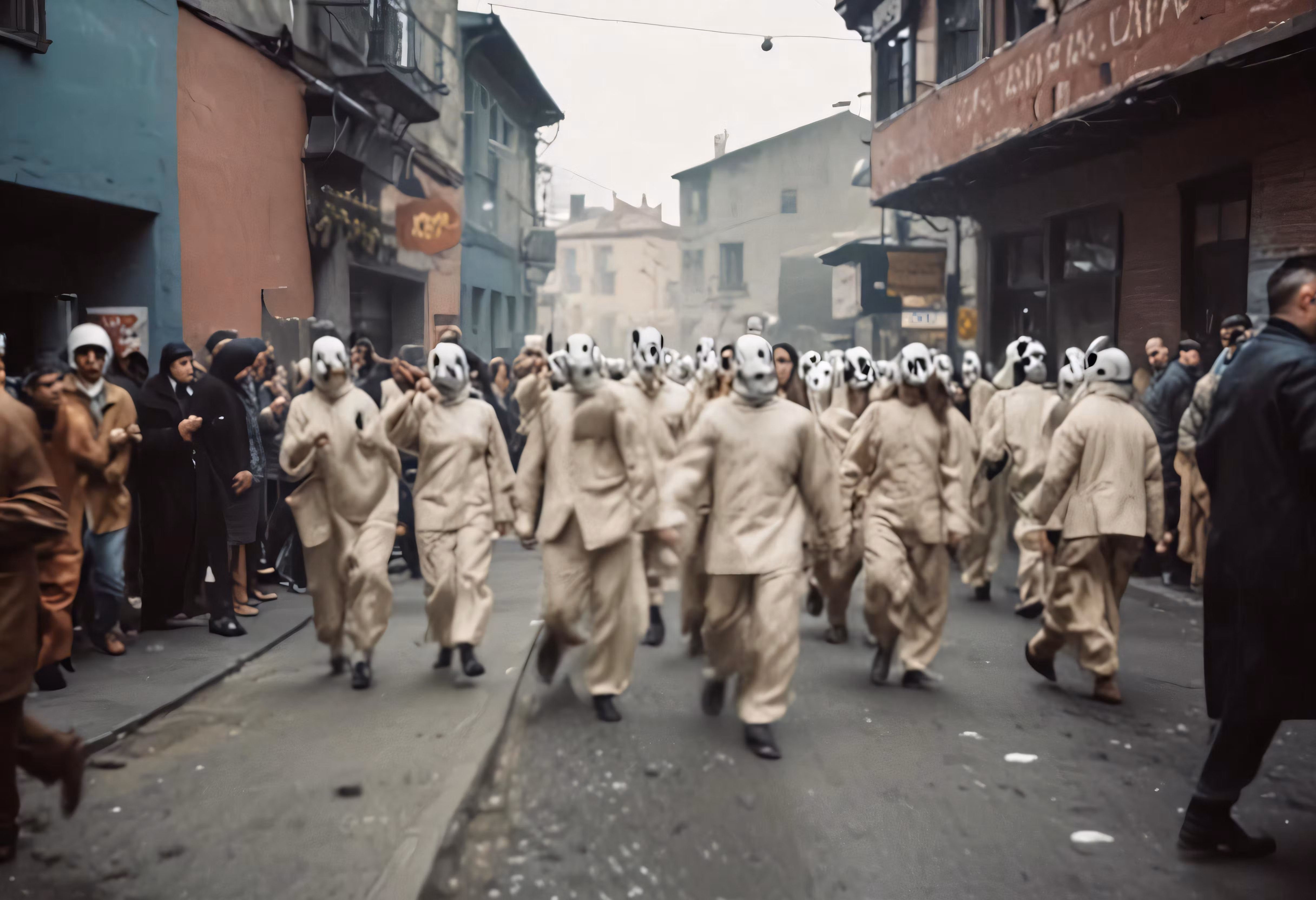 High resolution picture, free to use, a large group of people dressed as darth vader walk down a crowded street
