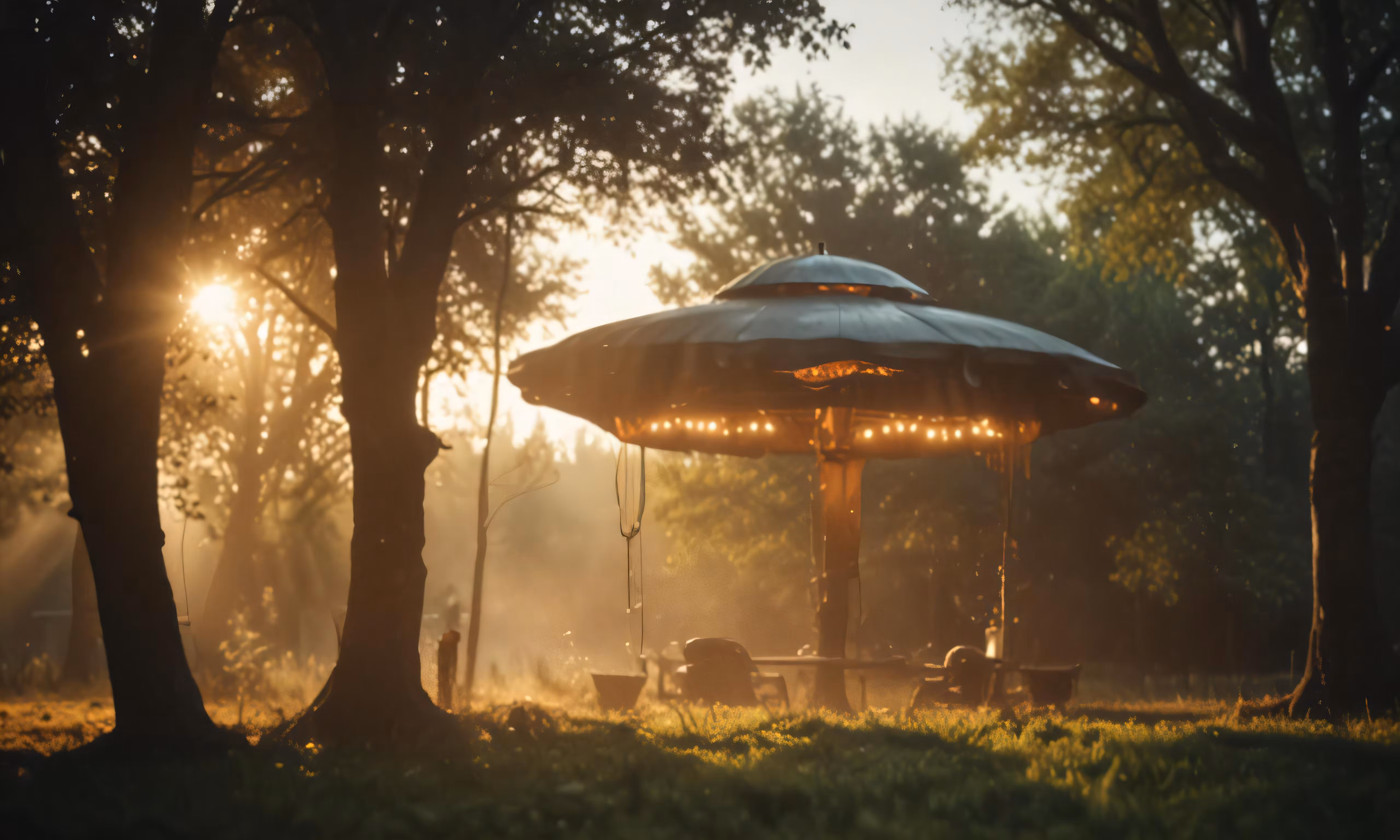 High resolution picture, free to use, a large illuminated carousel in a park setting