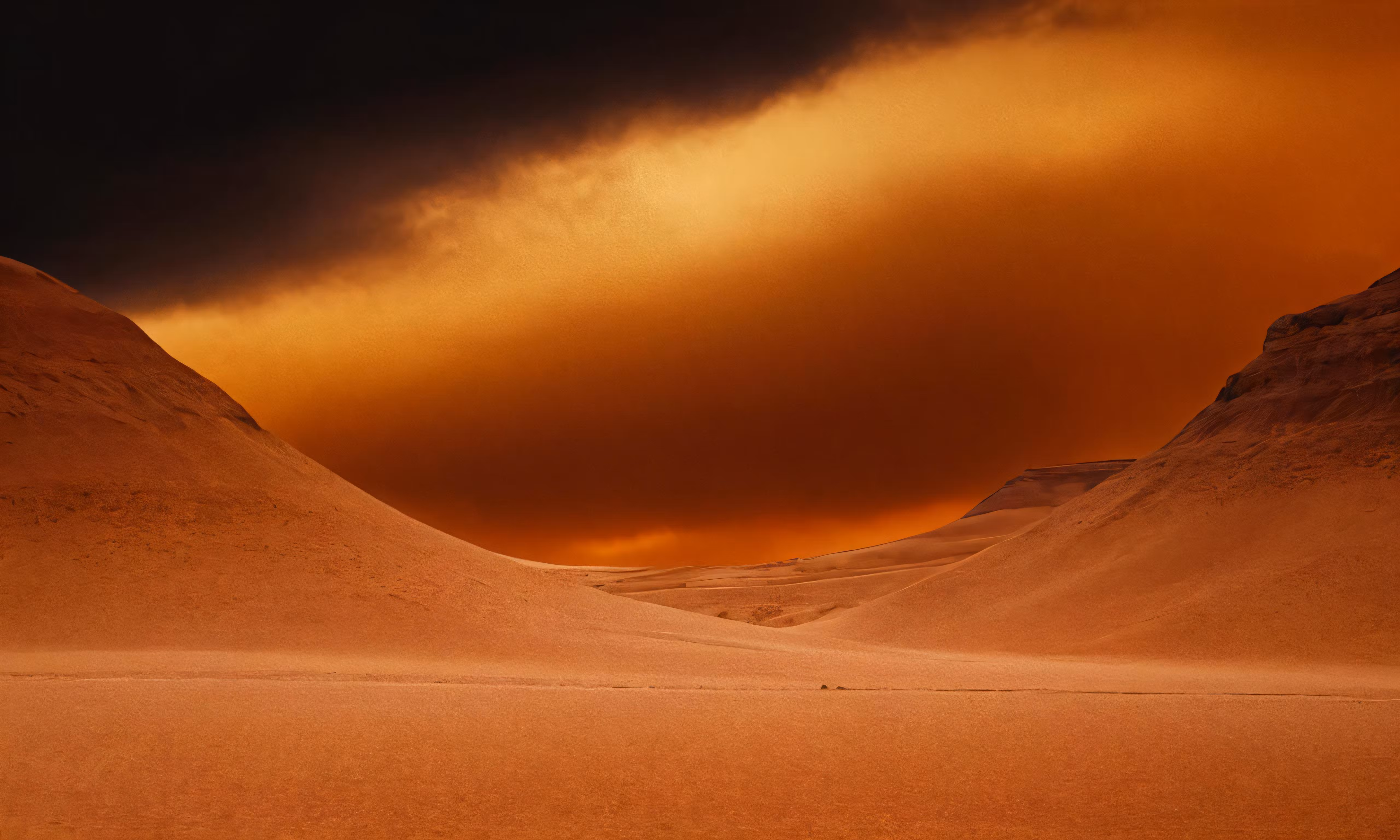 High resolution picture, free to use, a large rock outcropping in the desert is dark and orange as the sun goes down