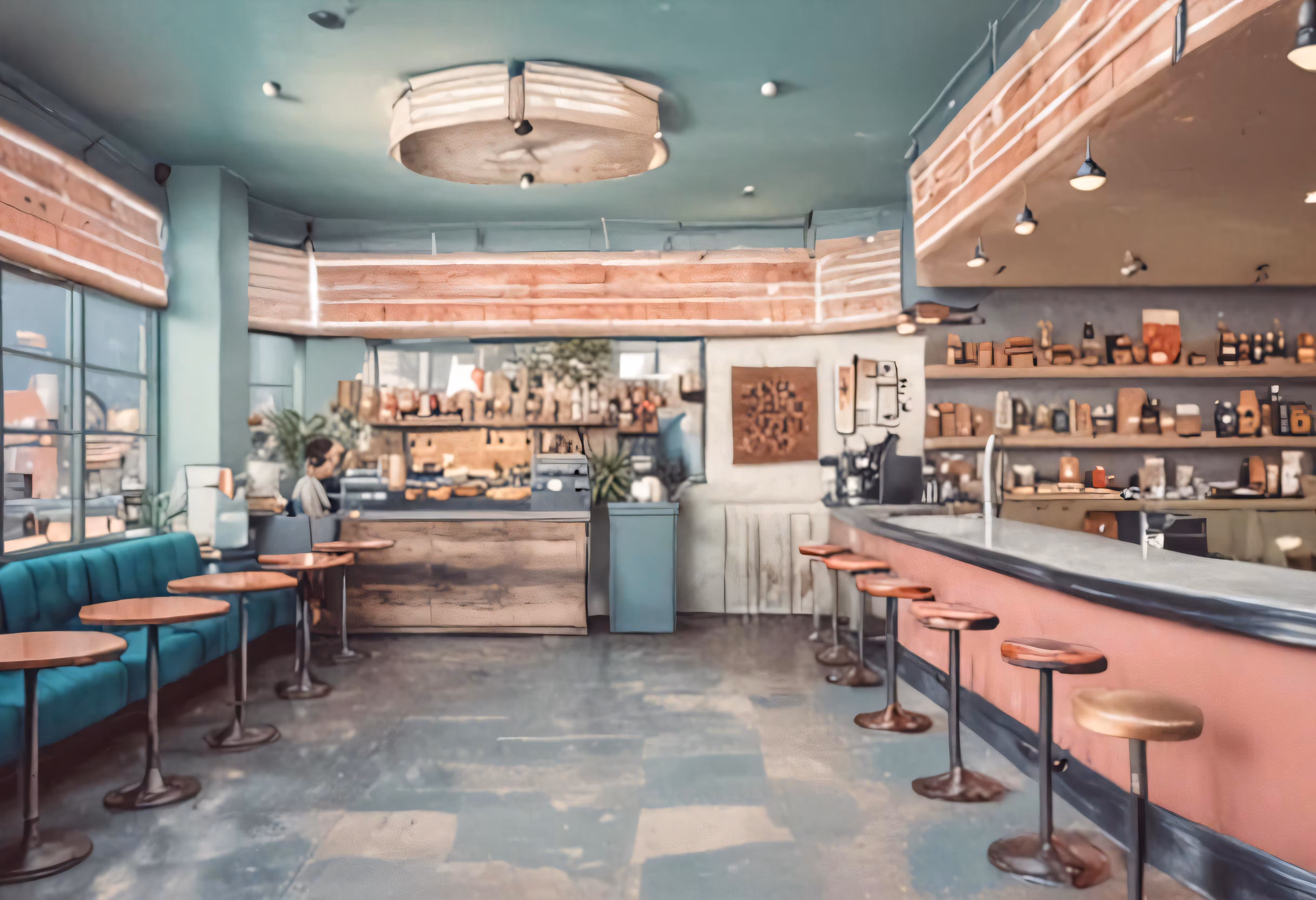 High resolution picture, free to use, a large room filled with bar chairs next to a window
