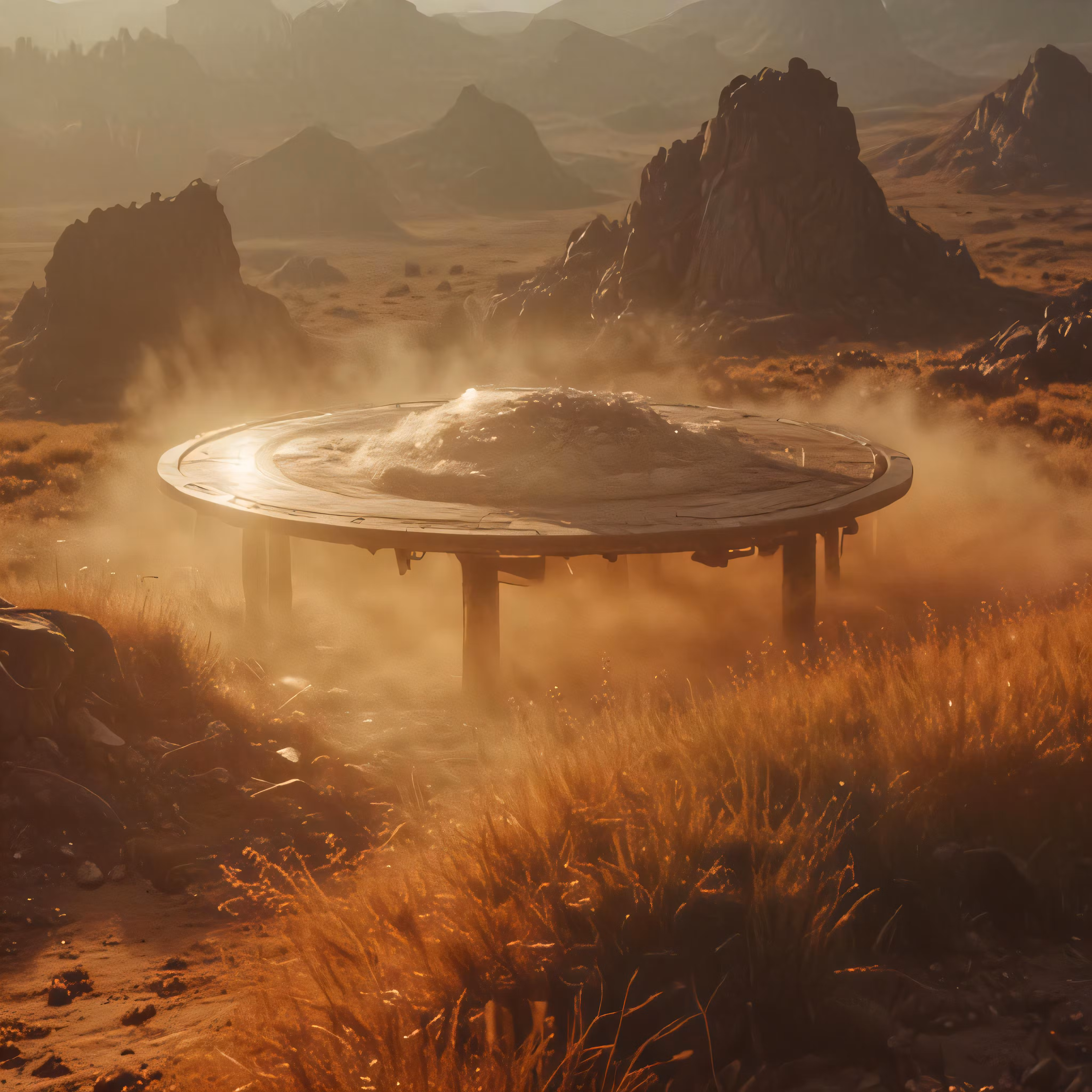 High resolution picture, free to use, a large round table surrounded by fog