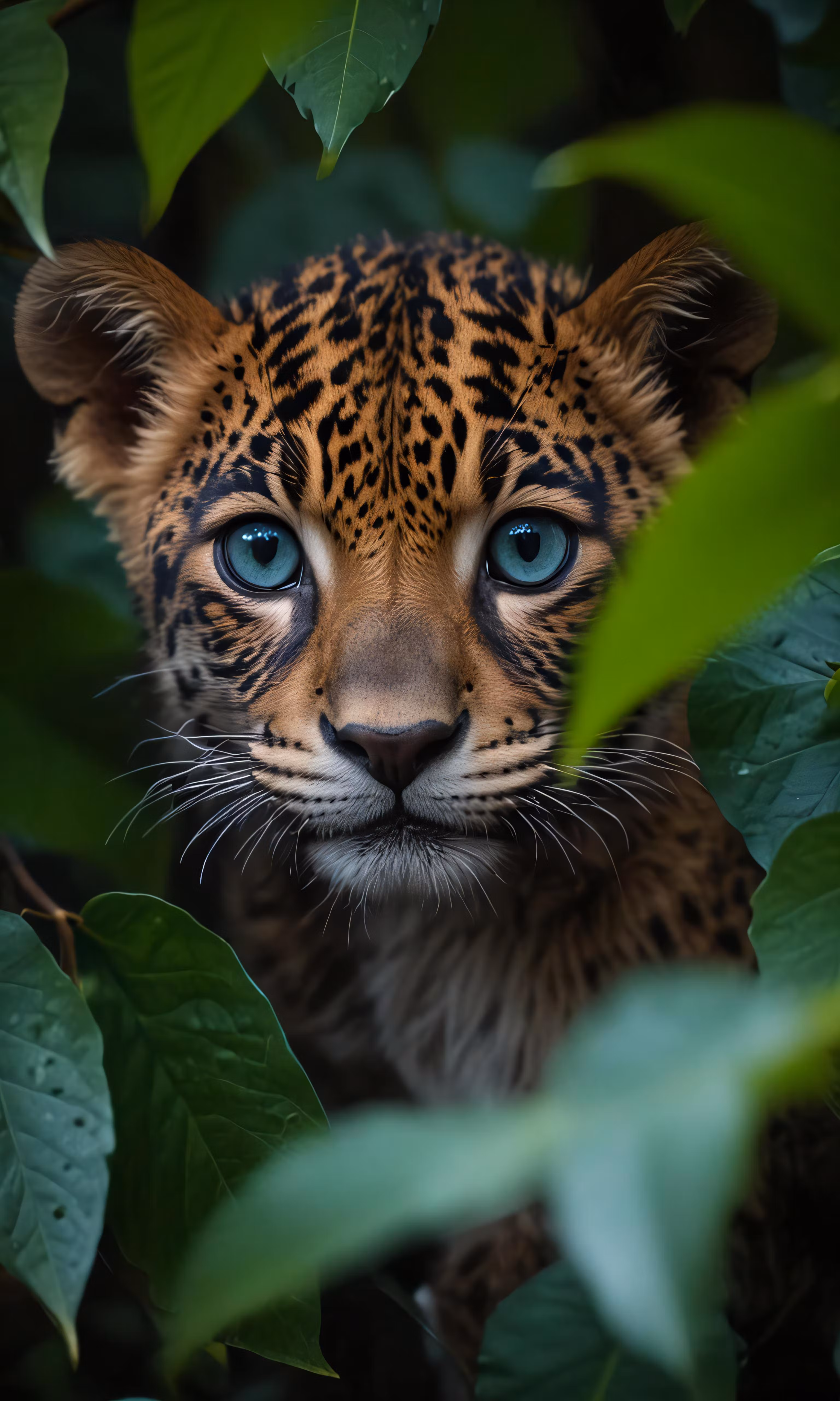 High resolution picture, free to use, a leopard with blue eyes hiding among green leaves