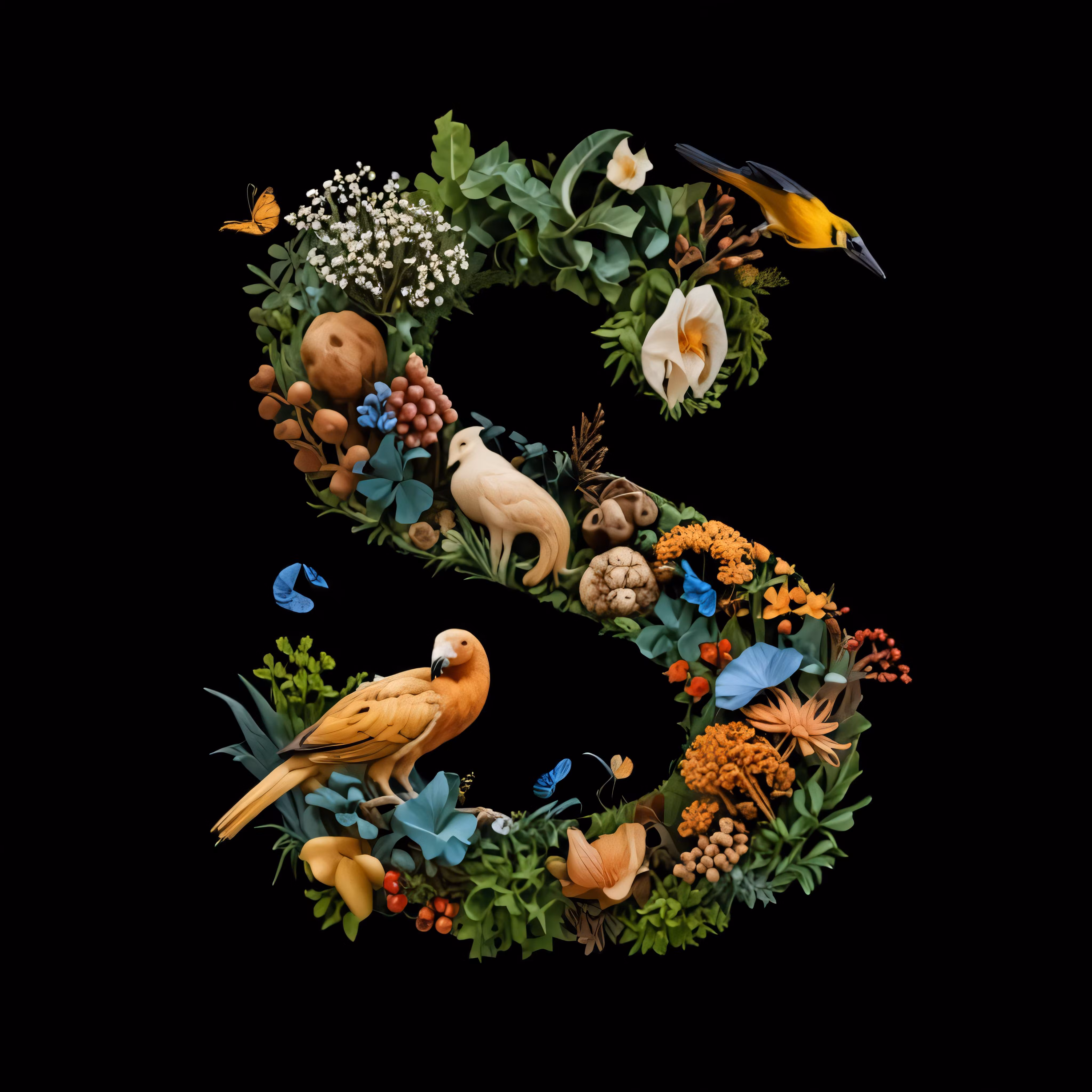 High resolution picture, free to use, a letter s made up of various flowers and birds