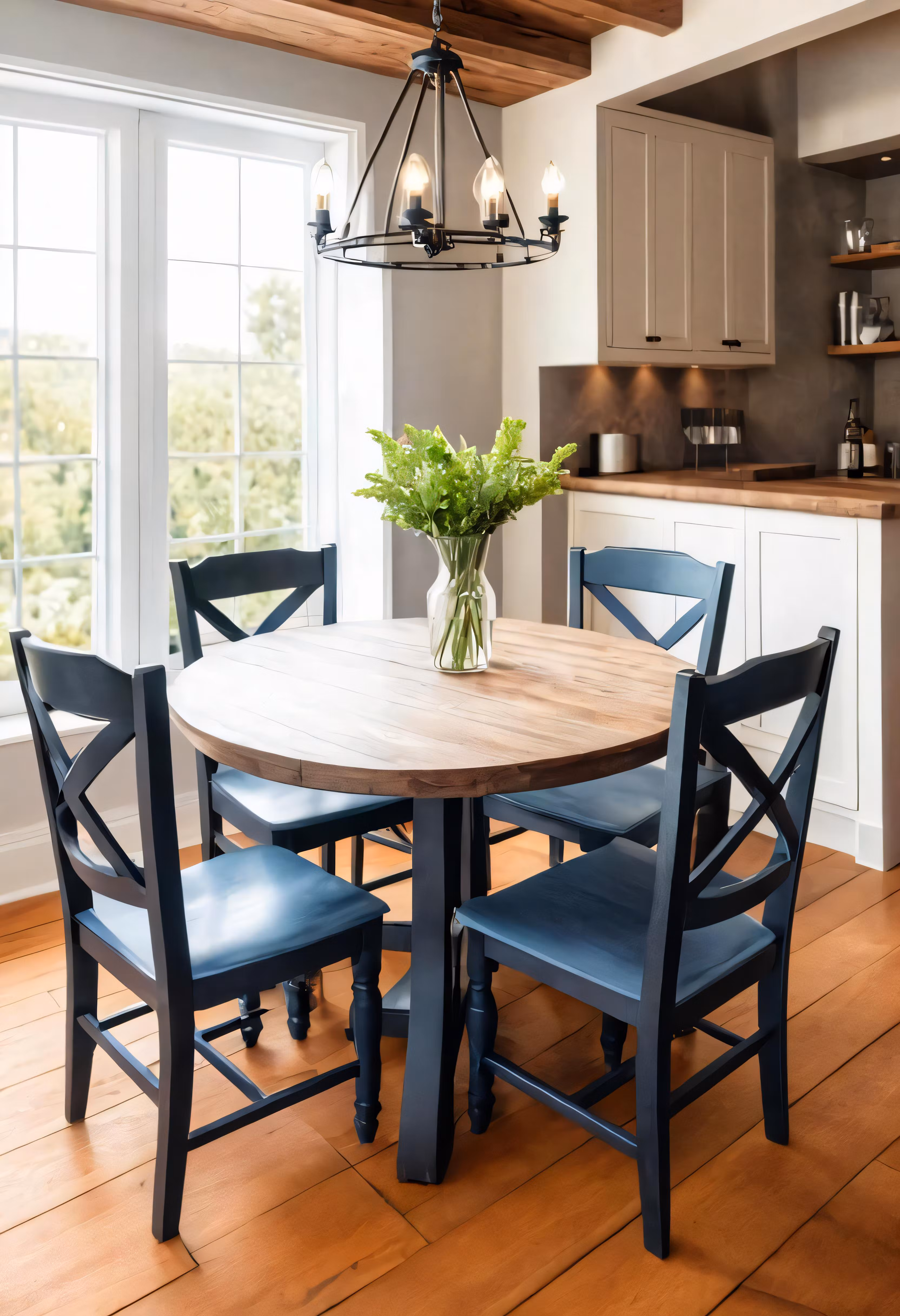 High resolution picture, free to use, a light wood dining table surrounded by blue chairs and kitchen cabinets
