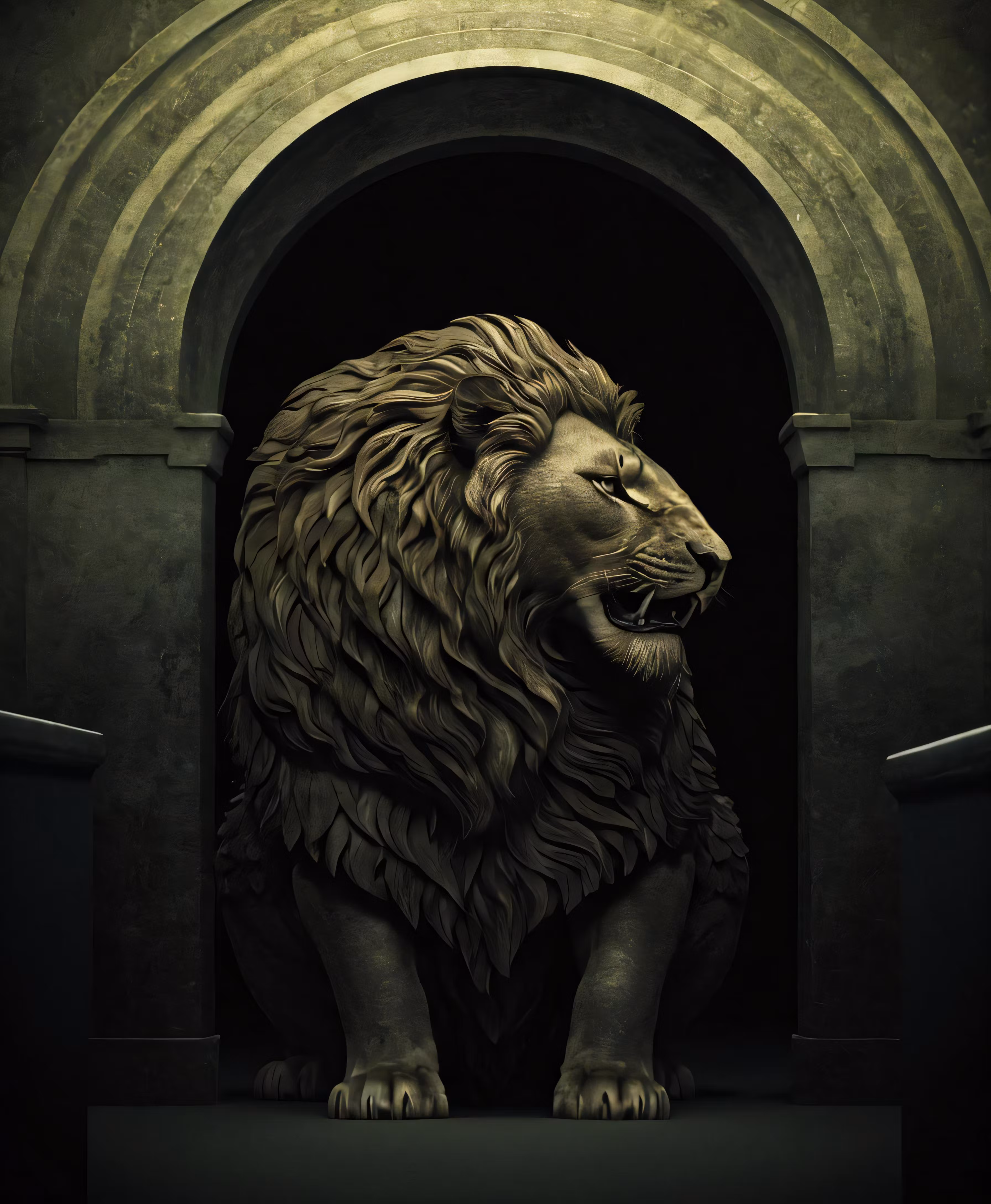 High resolution picture, free to use, a lion statue in front of a stone archway