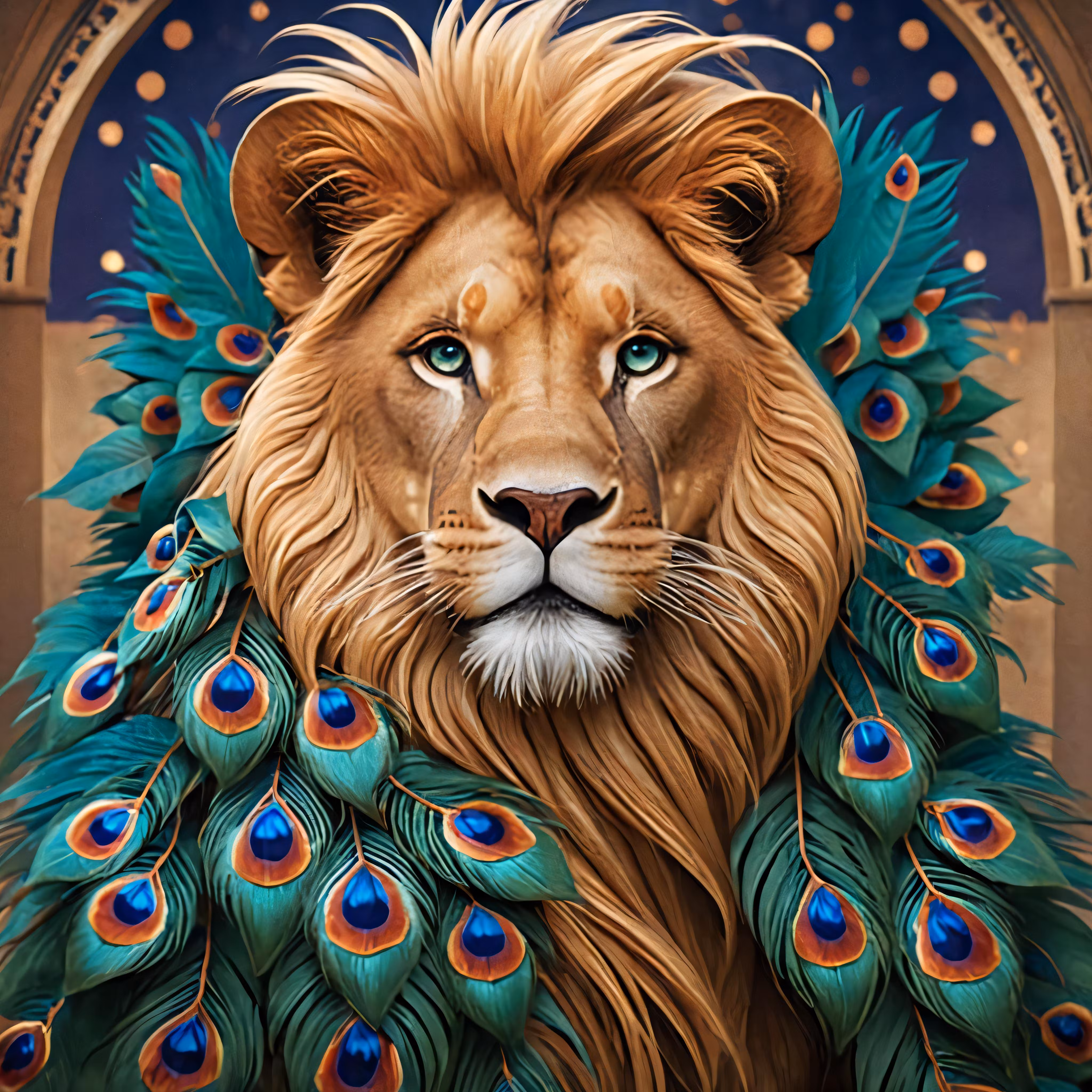 High resolution picture, free to use, a lion with feather like decorations on its head and chest