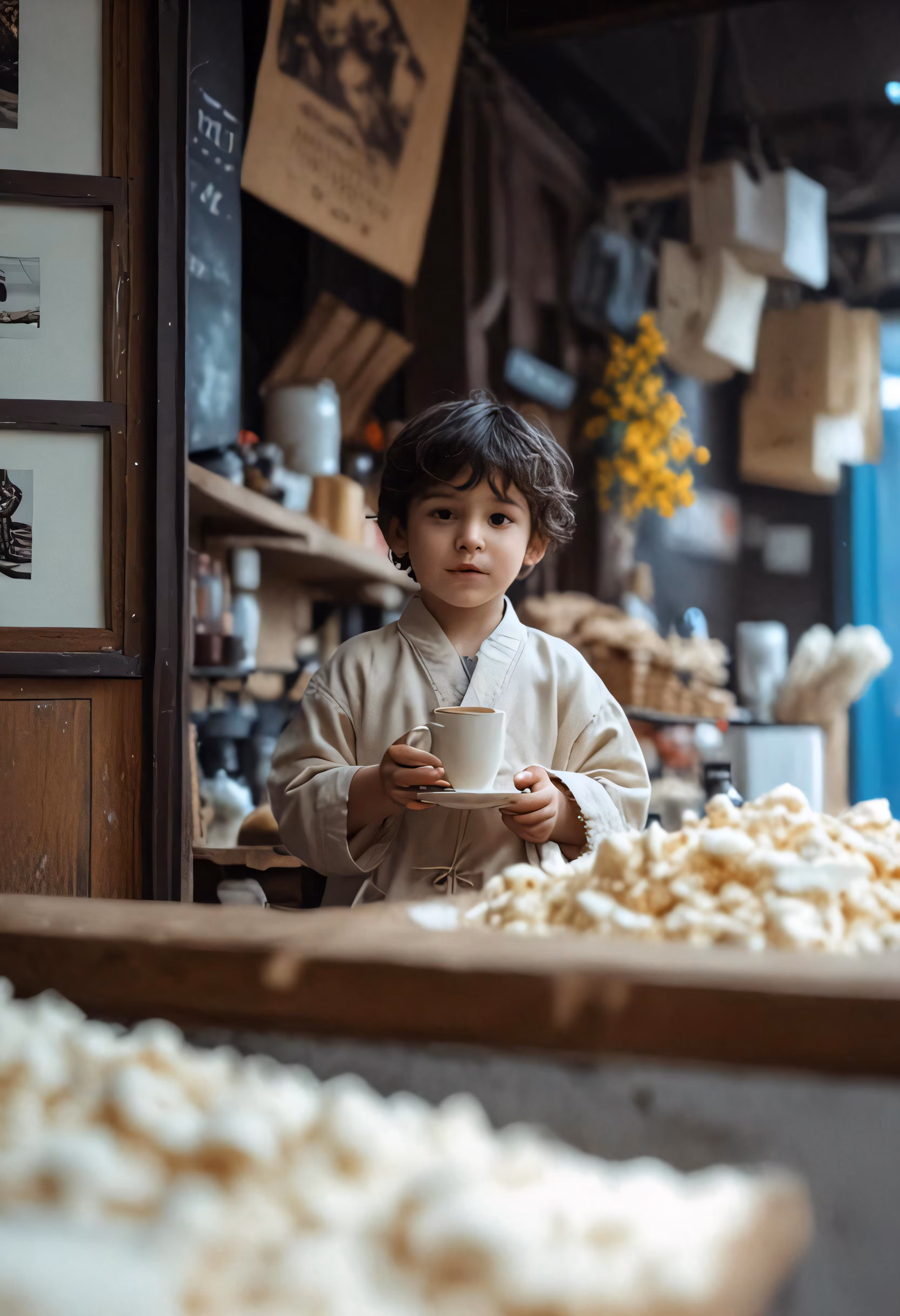 High resolution picture, free to use, a little boy standing in a store holding a coffee cup