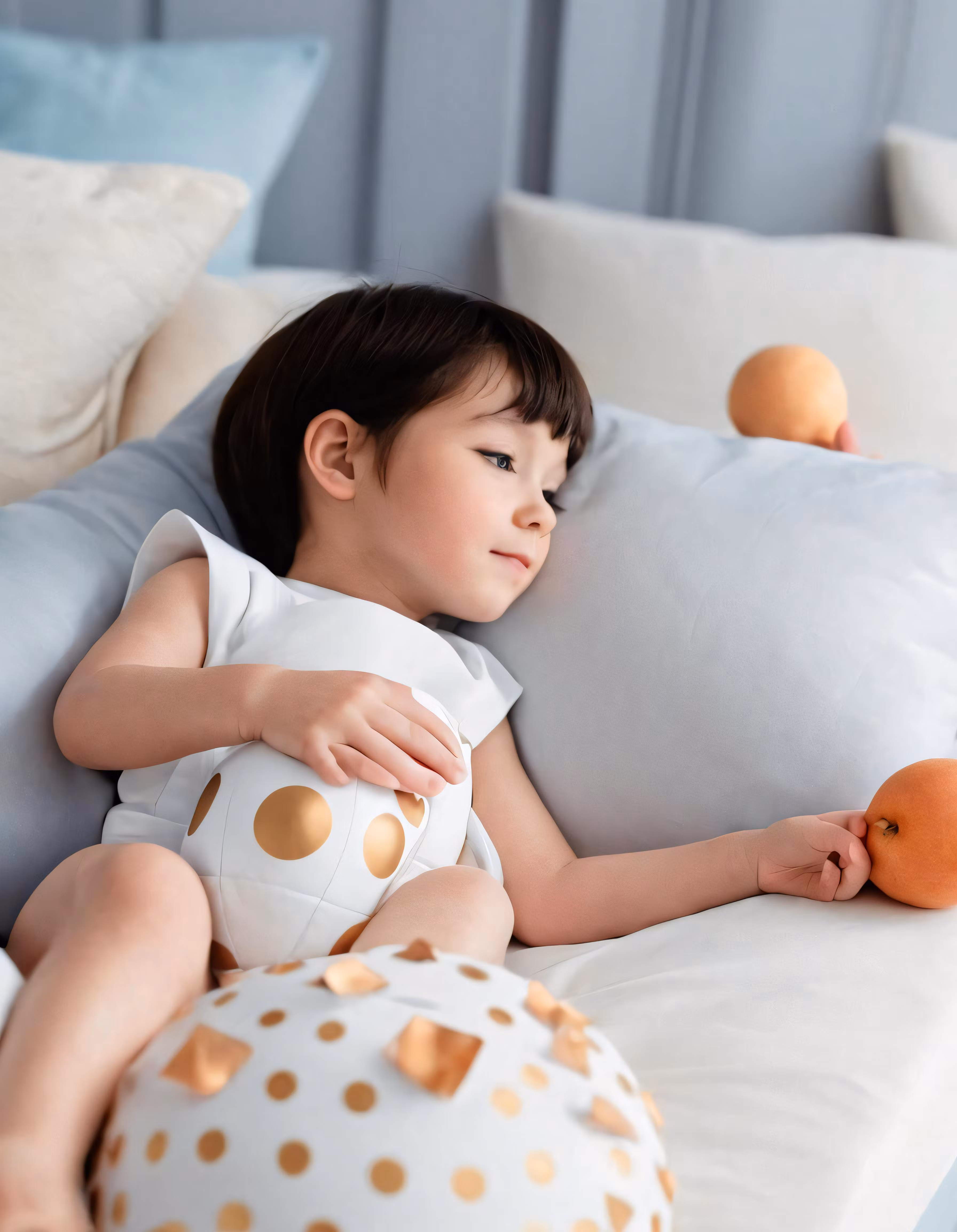 High resolution picture, free to use, a little girl laying on a bed with pillows and pillows