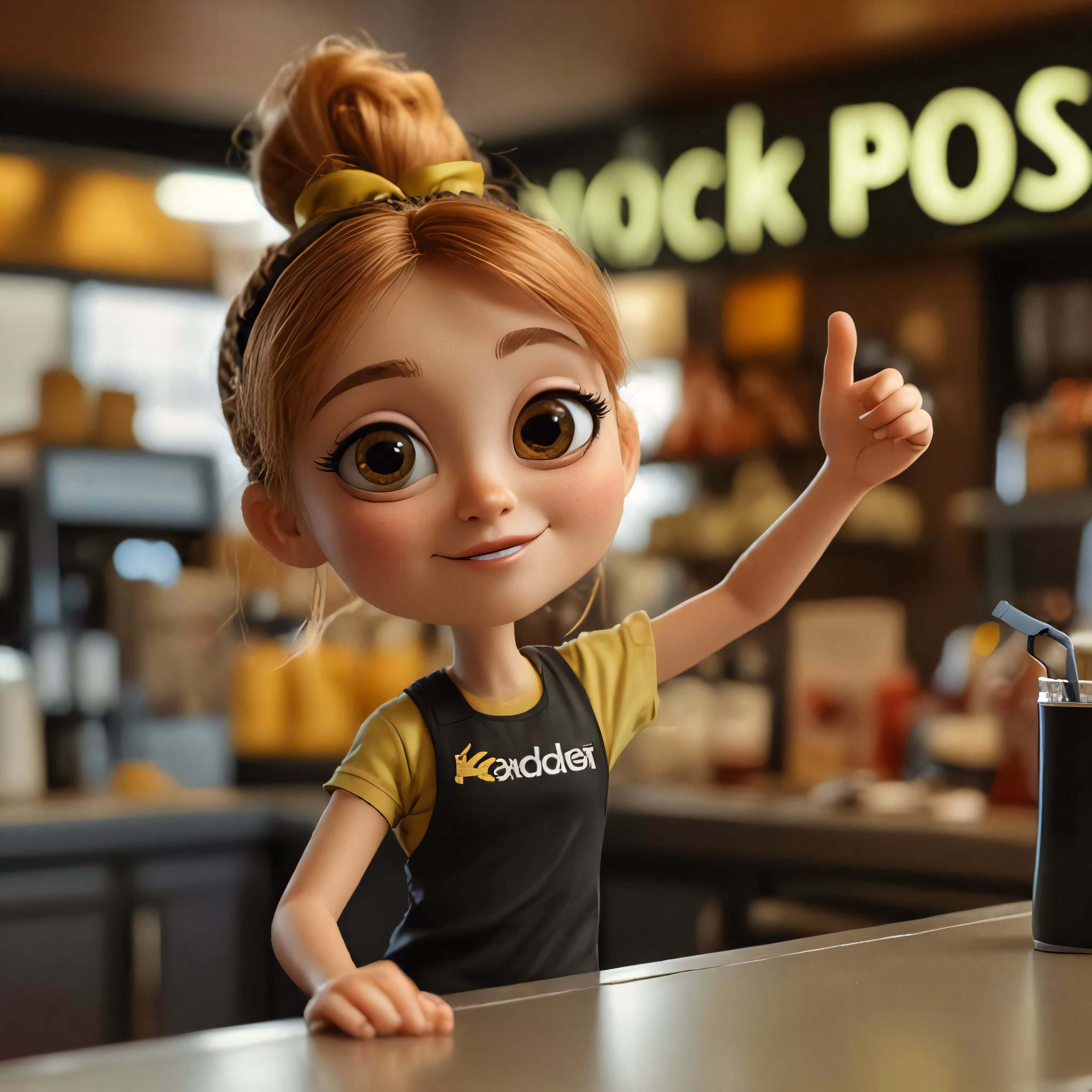High resolution picture, free to use, a little girl sitting at a counter in front of a fast food store