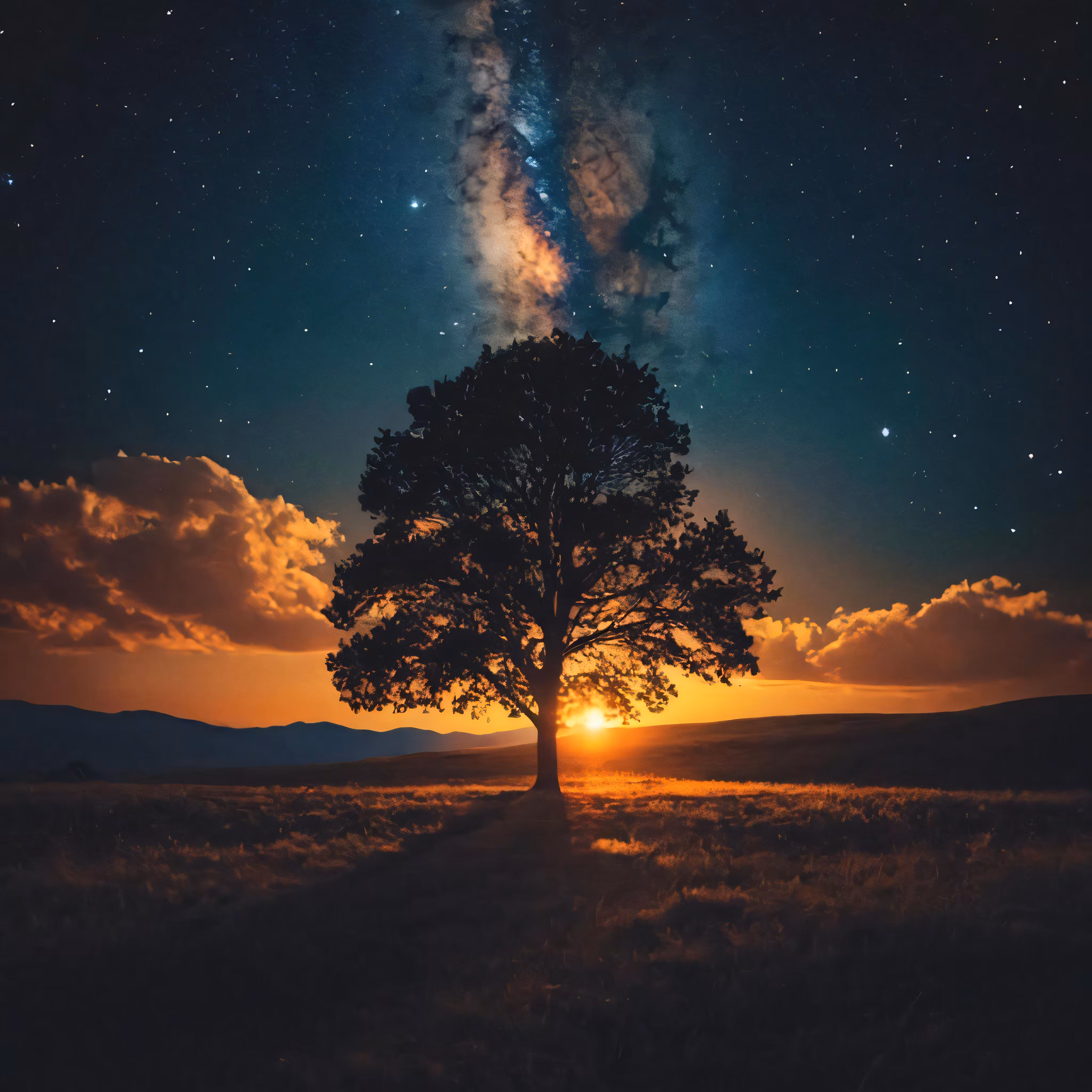 High resolution picture, free to use, a lone tree is silhouetted against a milky night