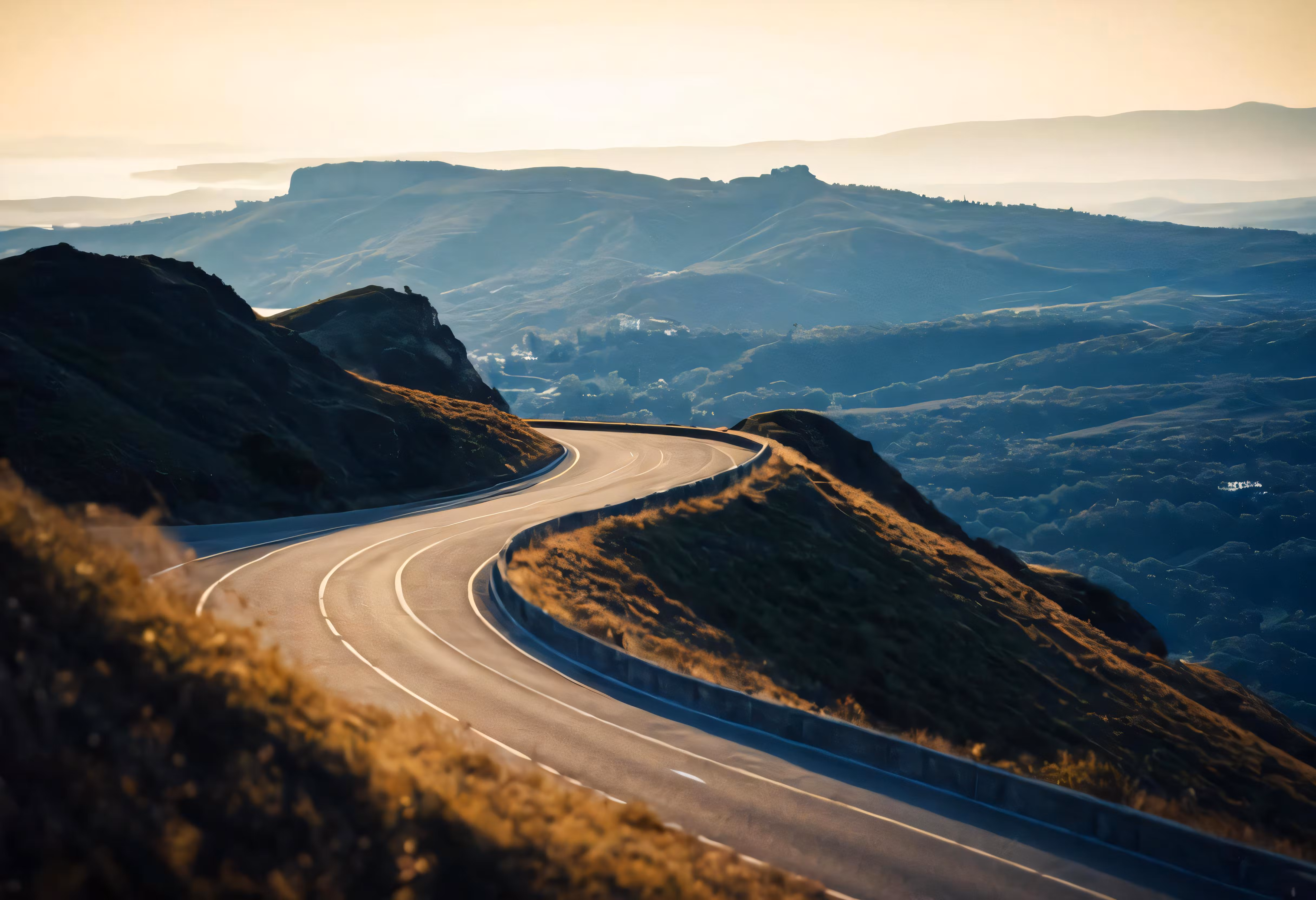 High resolution picture, free to use, a long winding curvy road stretches through a mountain range