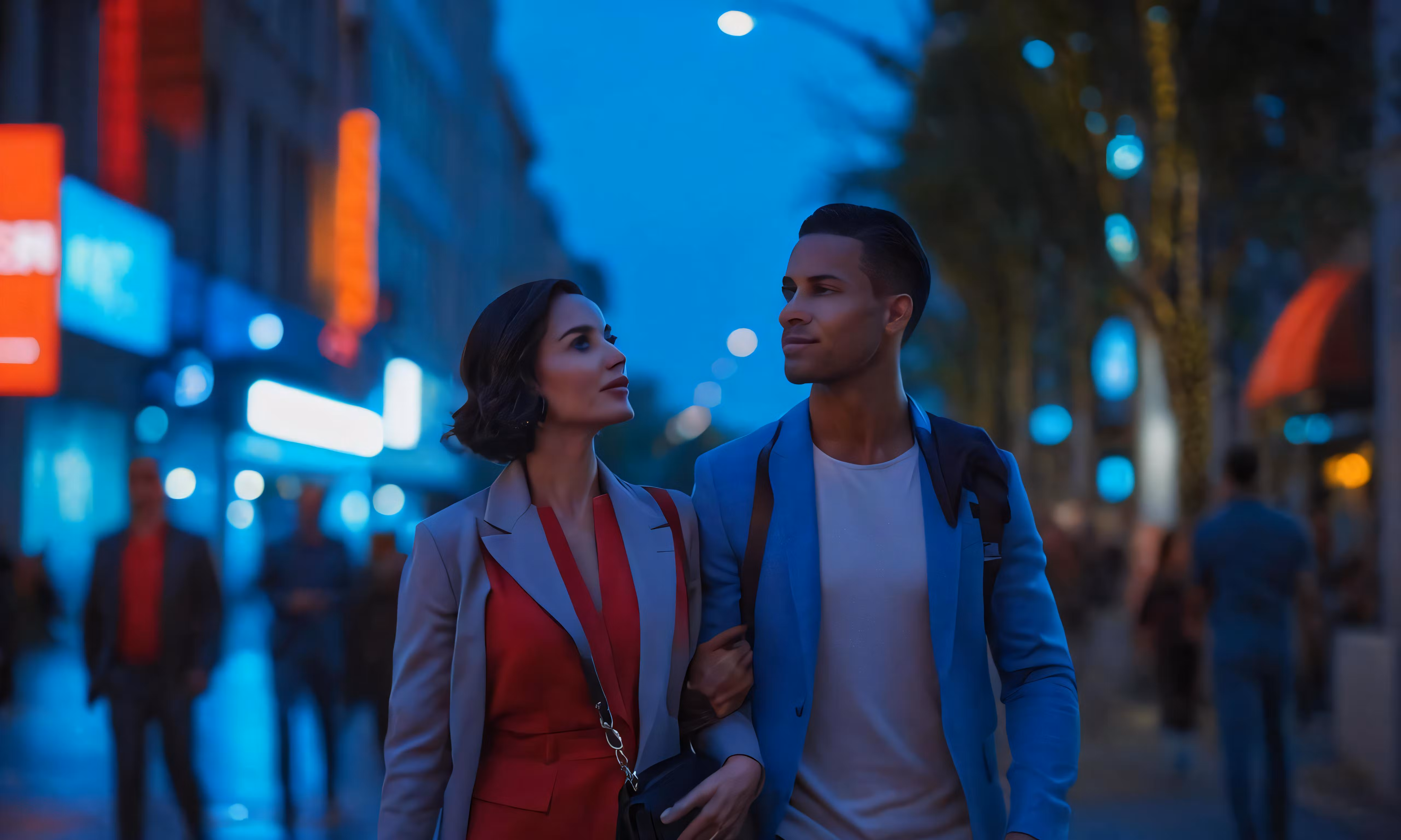 High resolution picture, free to use, a man and woman are standing in the middle of a city street