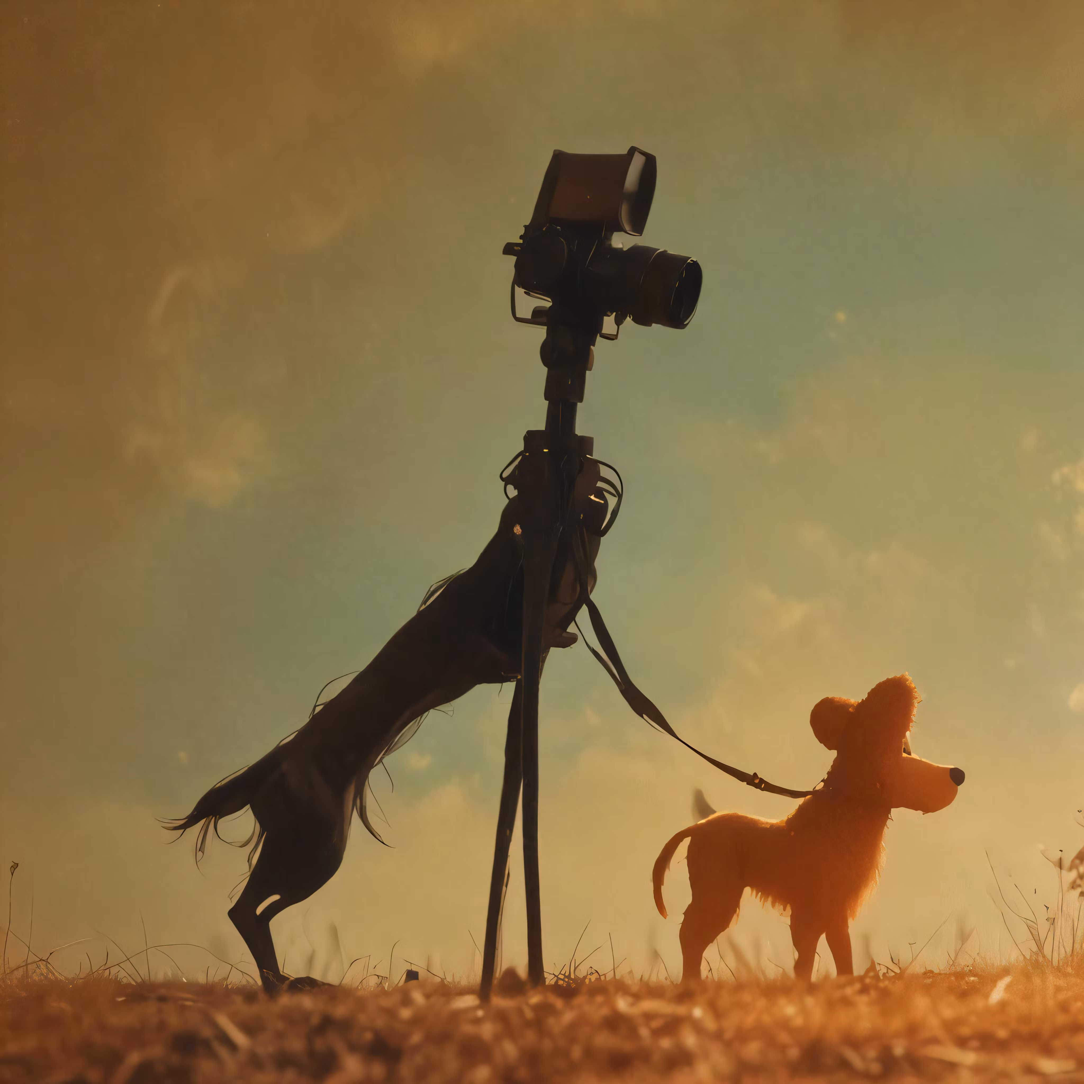 High resolution picture, free to use, a man filming a puppy with a tripod next to a tree