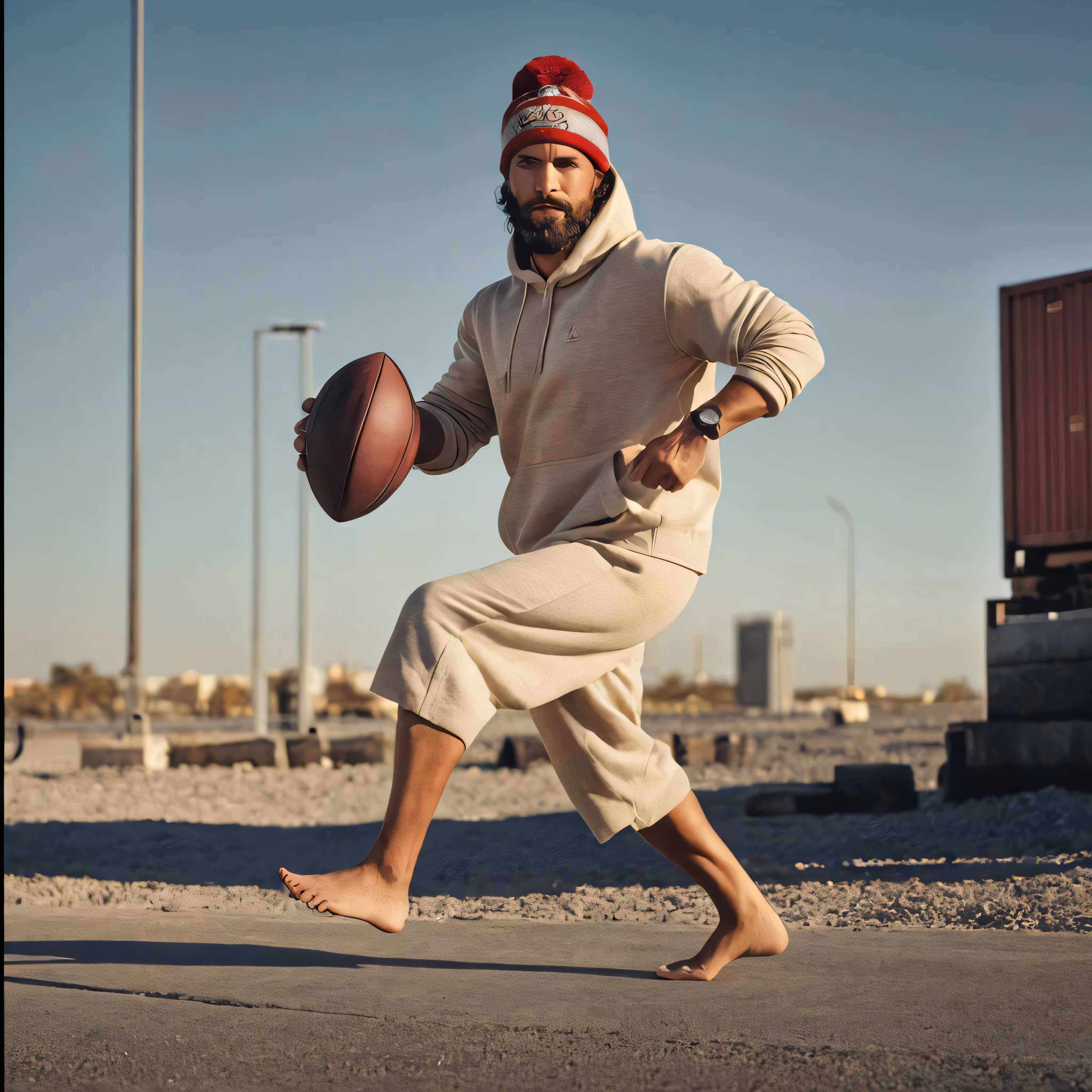 High resolution picture, free to use, a man holding a football while walking across a street