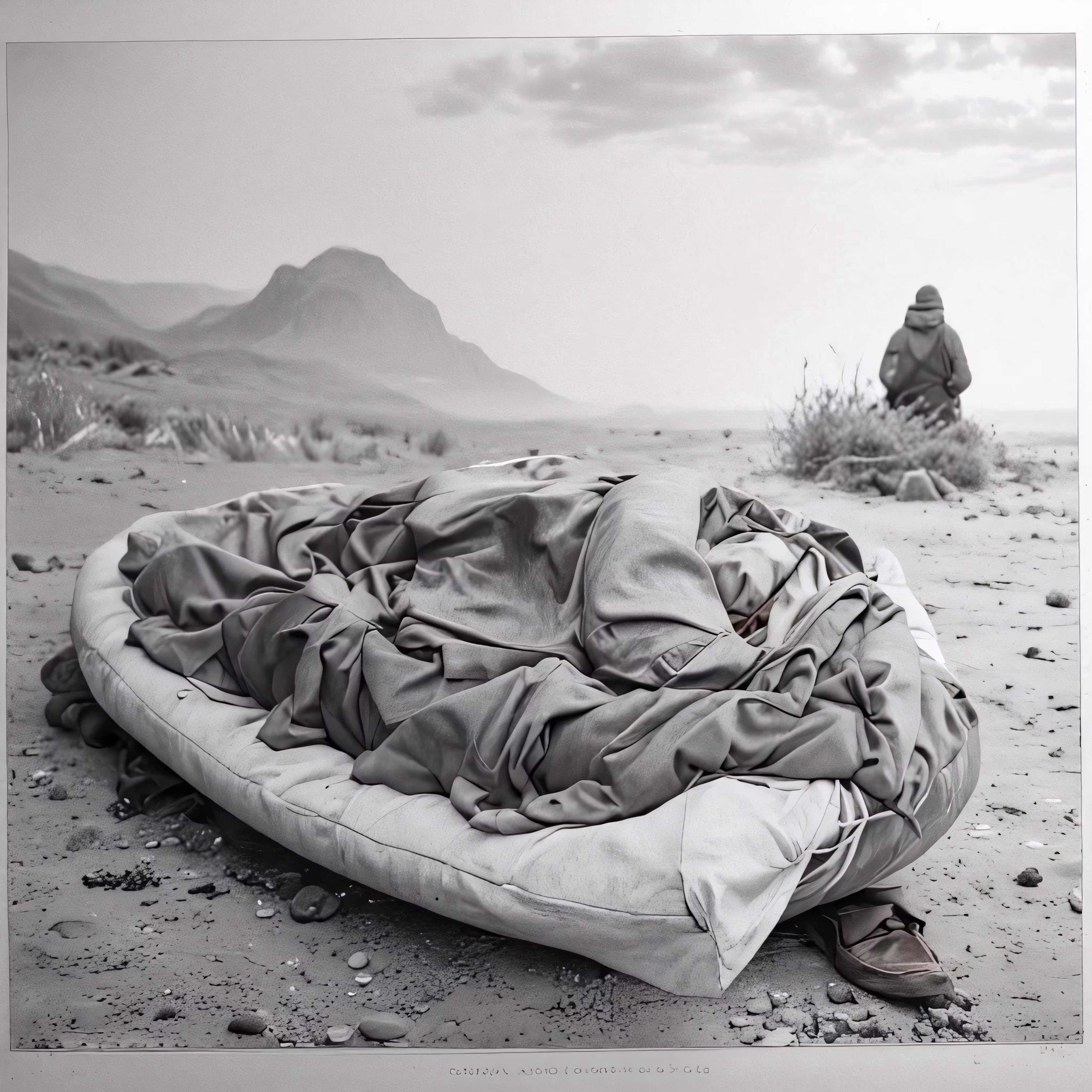 High resolution picture, free to use, a man in a desert setting kneeling over a sleeping bag