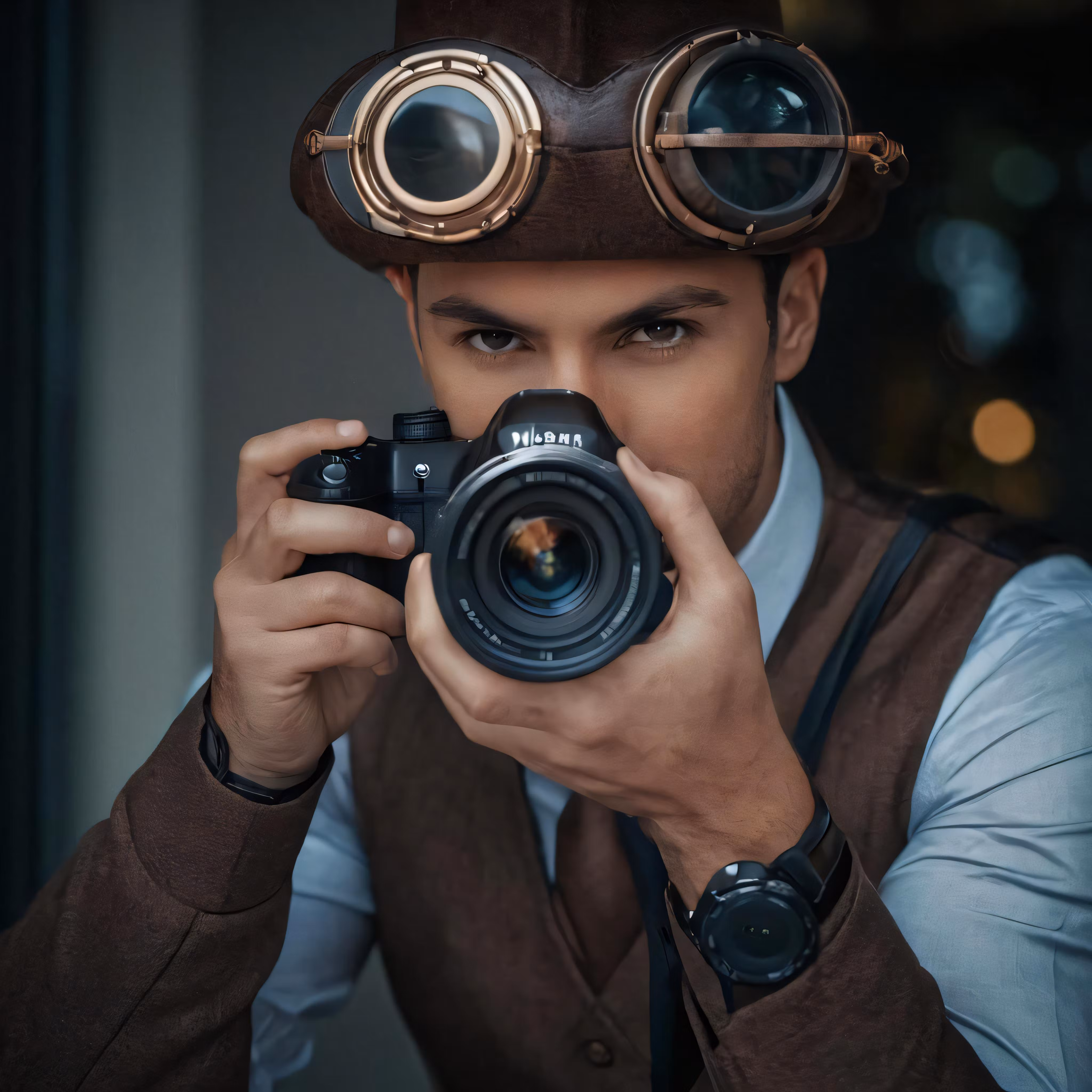 High resolution picture, free to use, a man in a hat and goggles holding a camera
