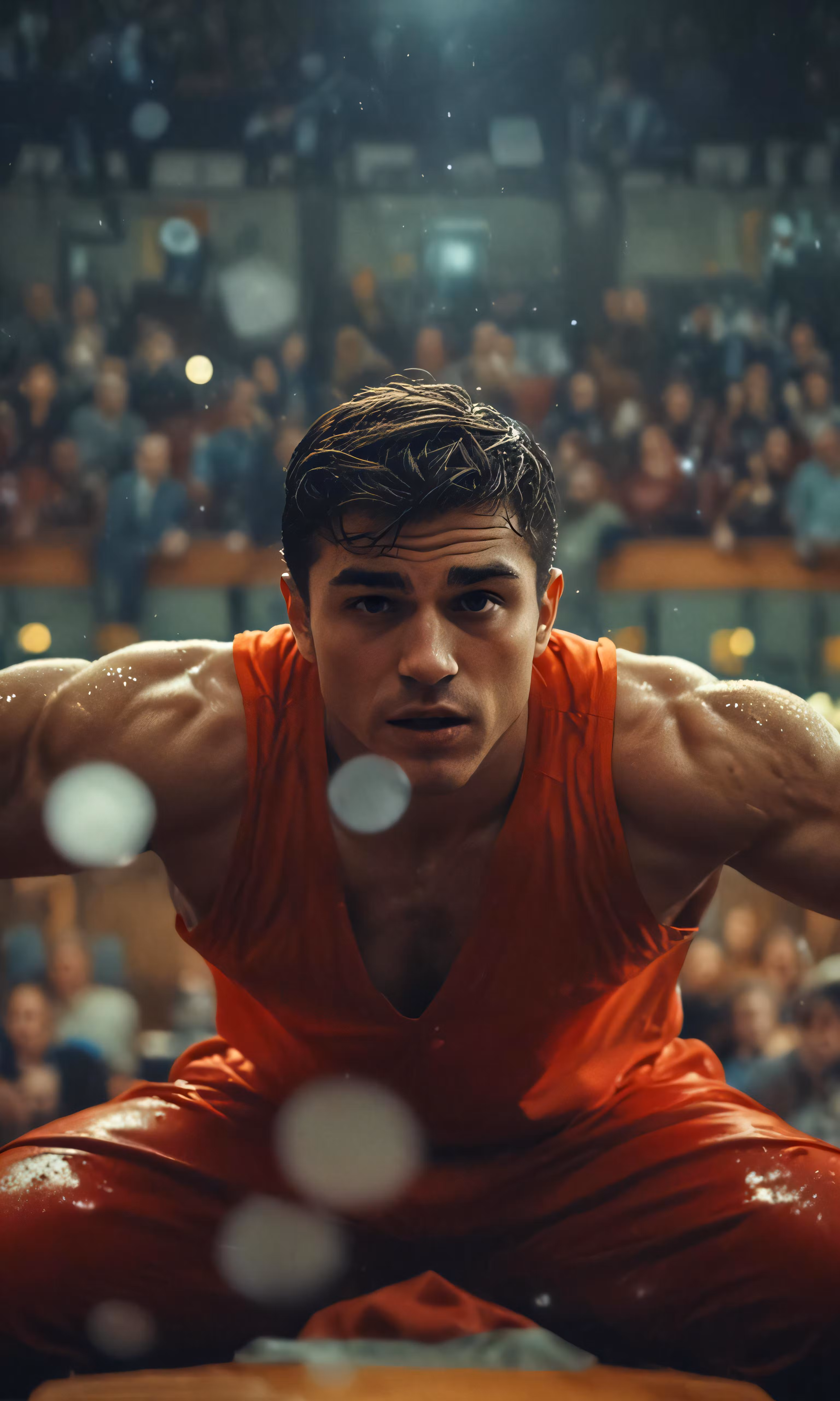 High resolution picture, free to use, a man in a red shirt and his arms are stretched out on his knees as he squats