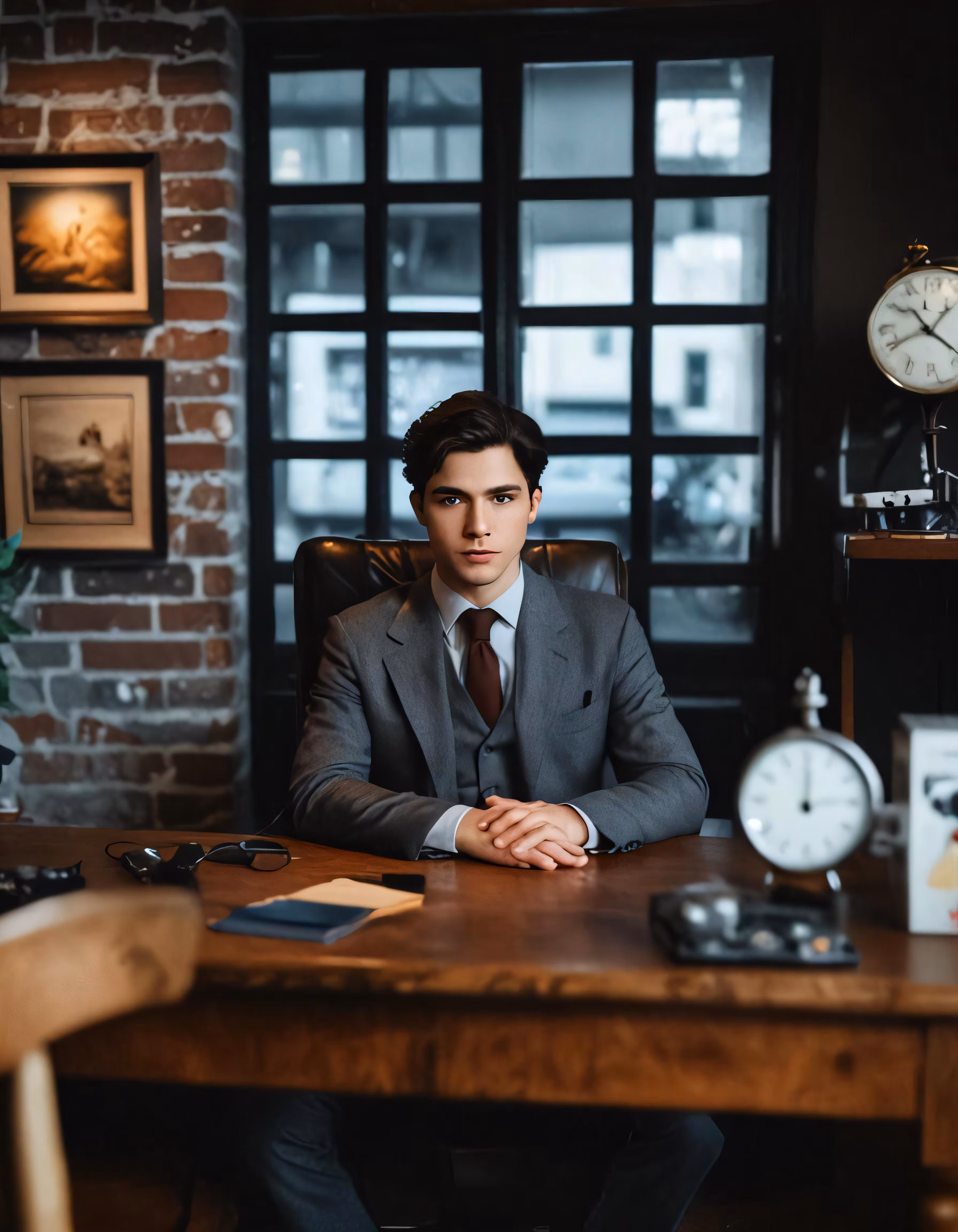 High resolution picture, free to use, a man in a suit sits in front of a desk