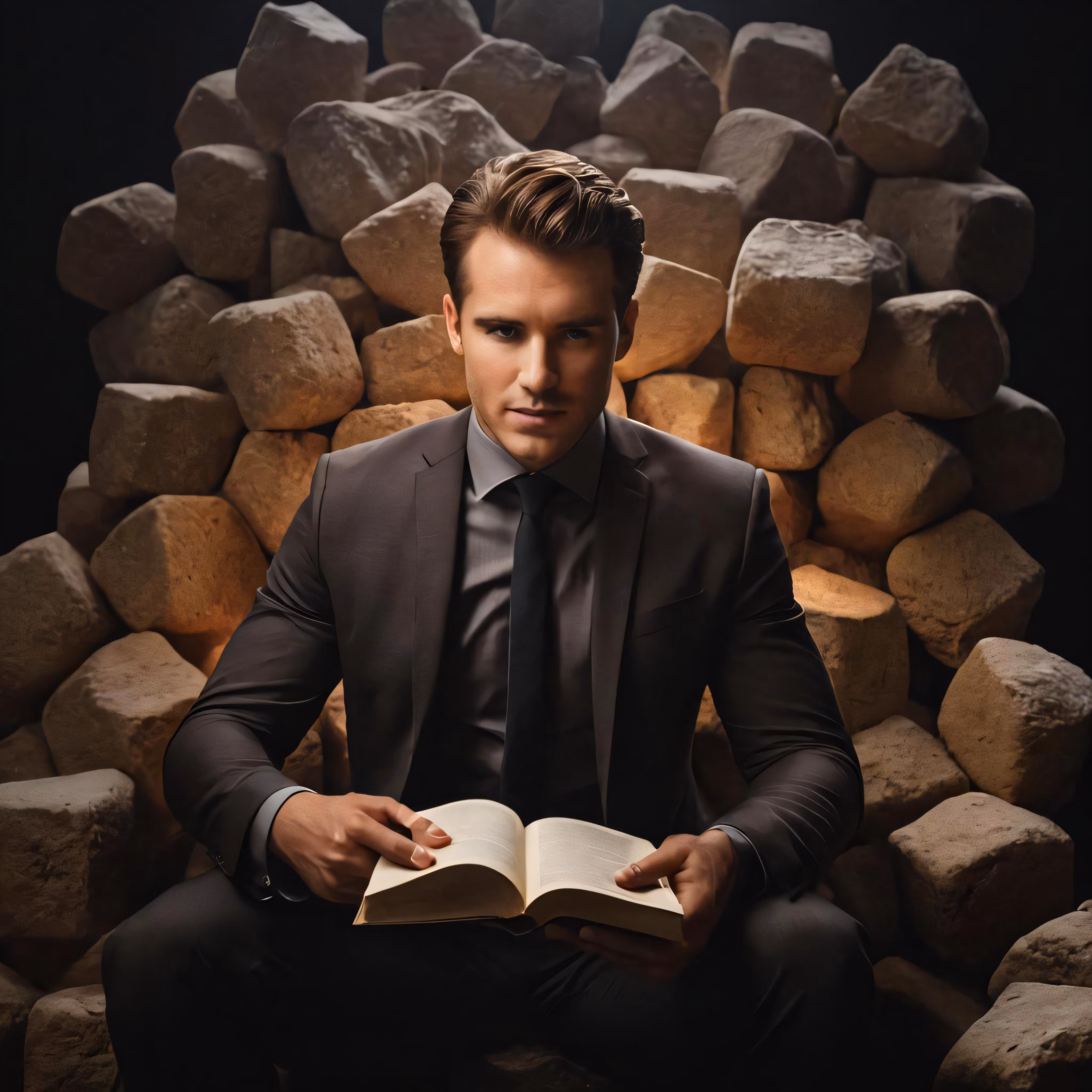 High resolution picture, free to use, a man in a suit sitting on a rock wall holding an open book