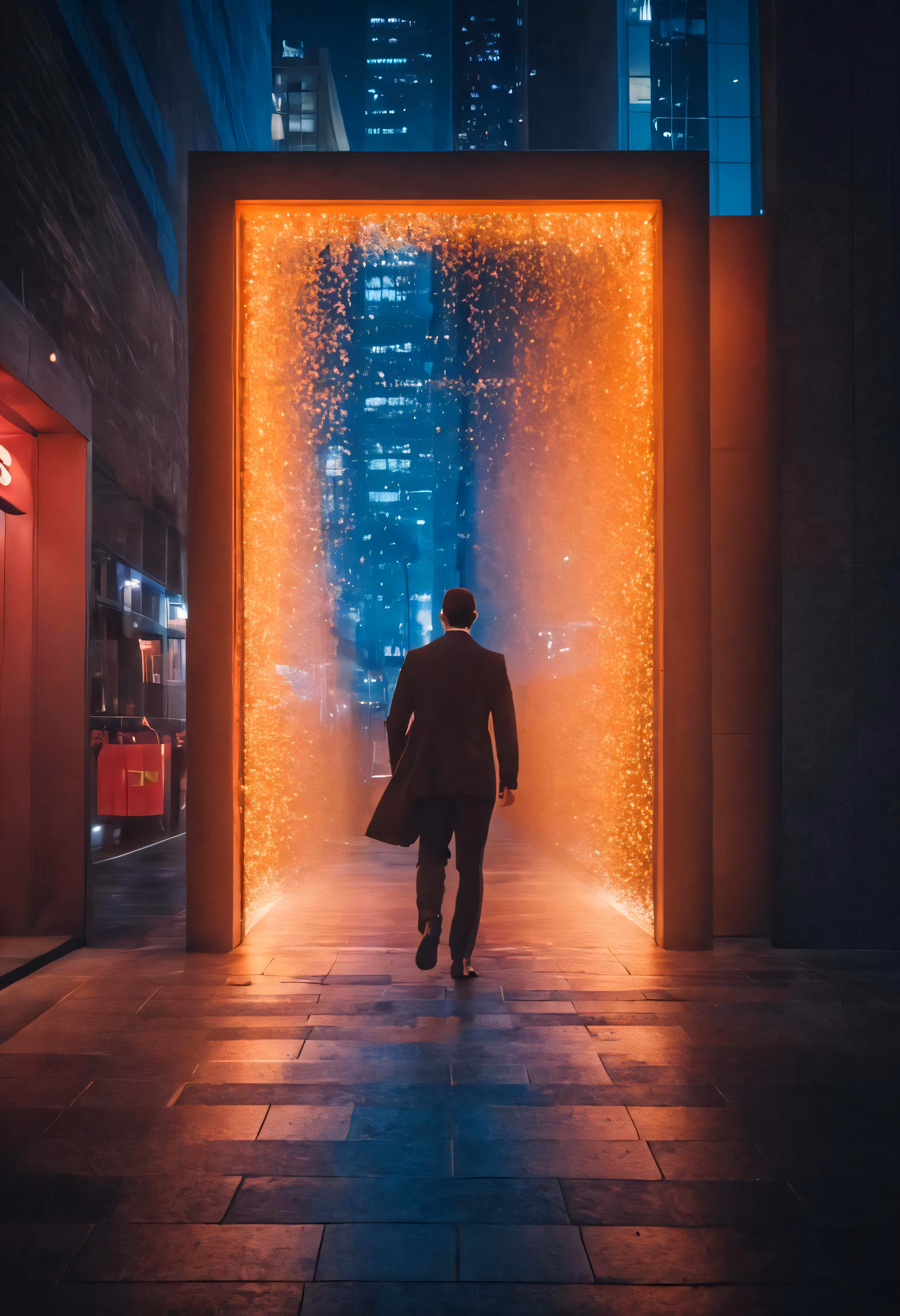 High resolution picture, free to use, a man in a suit walking into a red door that is illuminated with water