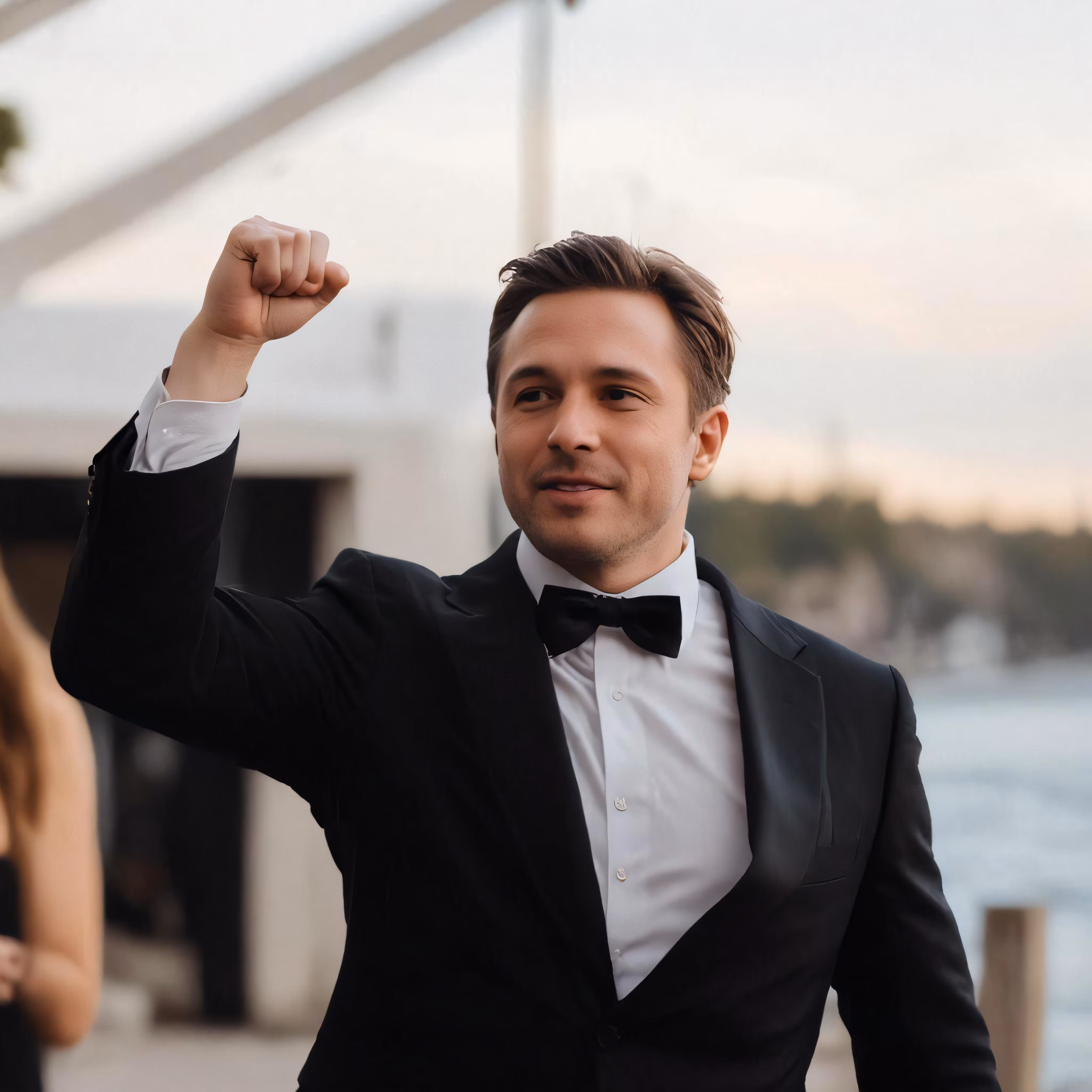 High resolution picture, free to use, a man in a tuxedo waves to the crowd