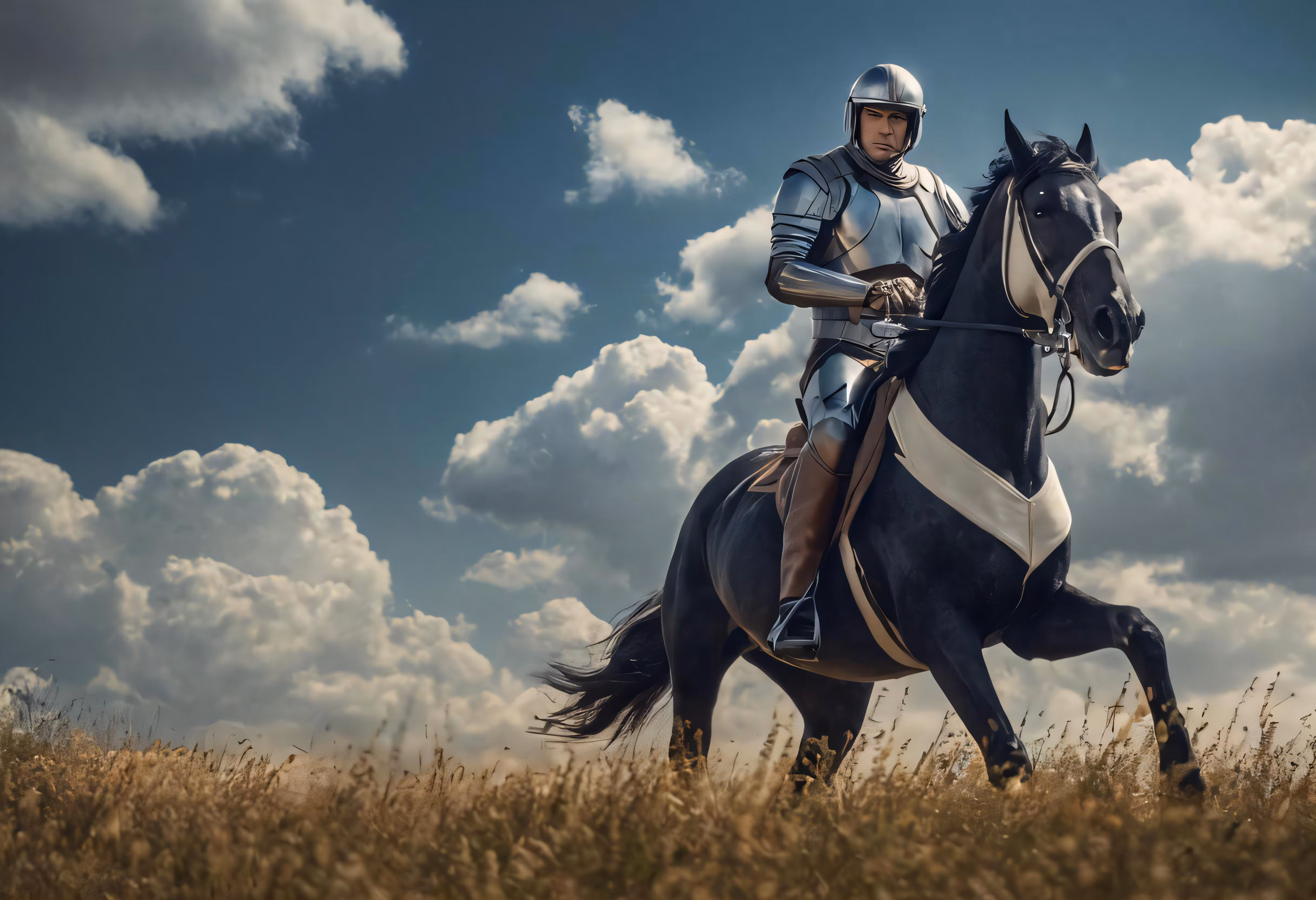 High resolution picture, free to use, a man in armor riding a horse through the field