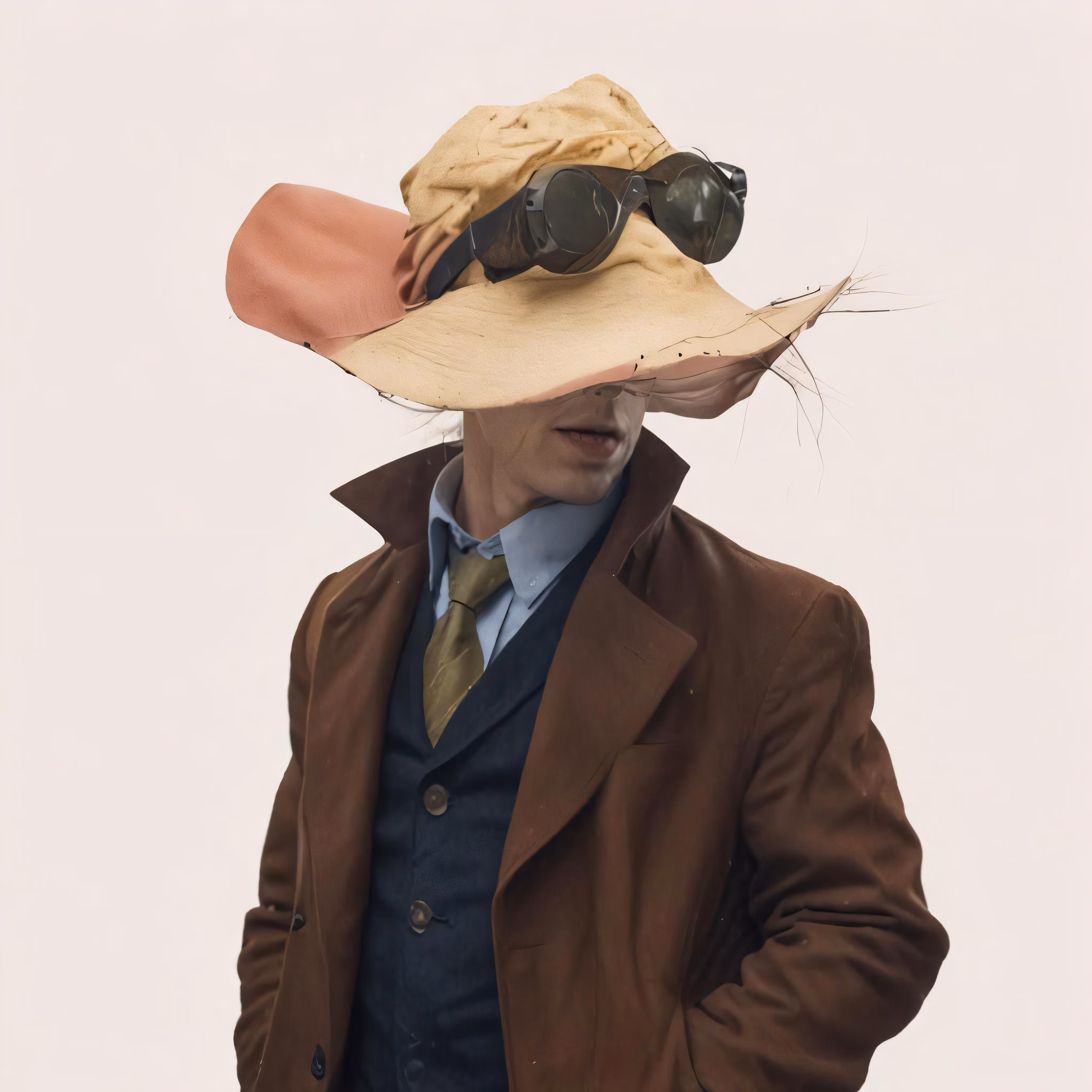 High resolution picture, free to use, a man in suit and hat with large glasses on top of his head
