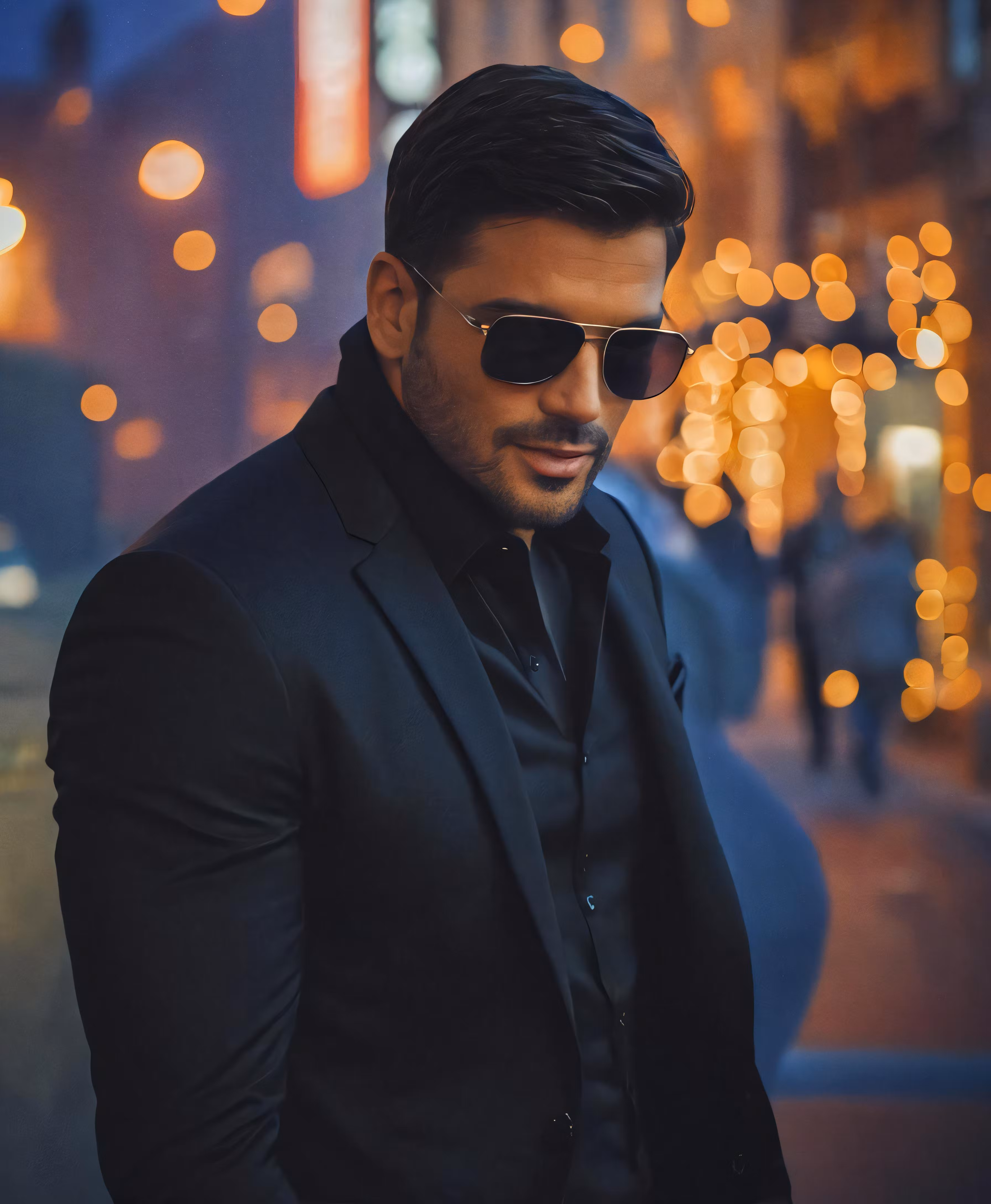 High resolution picture, free to use, a man in sunglasses standing next to a building