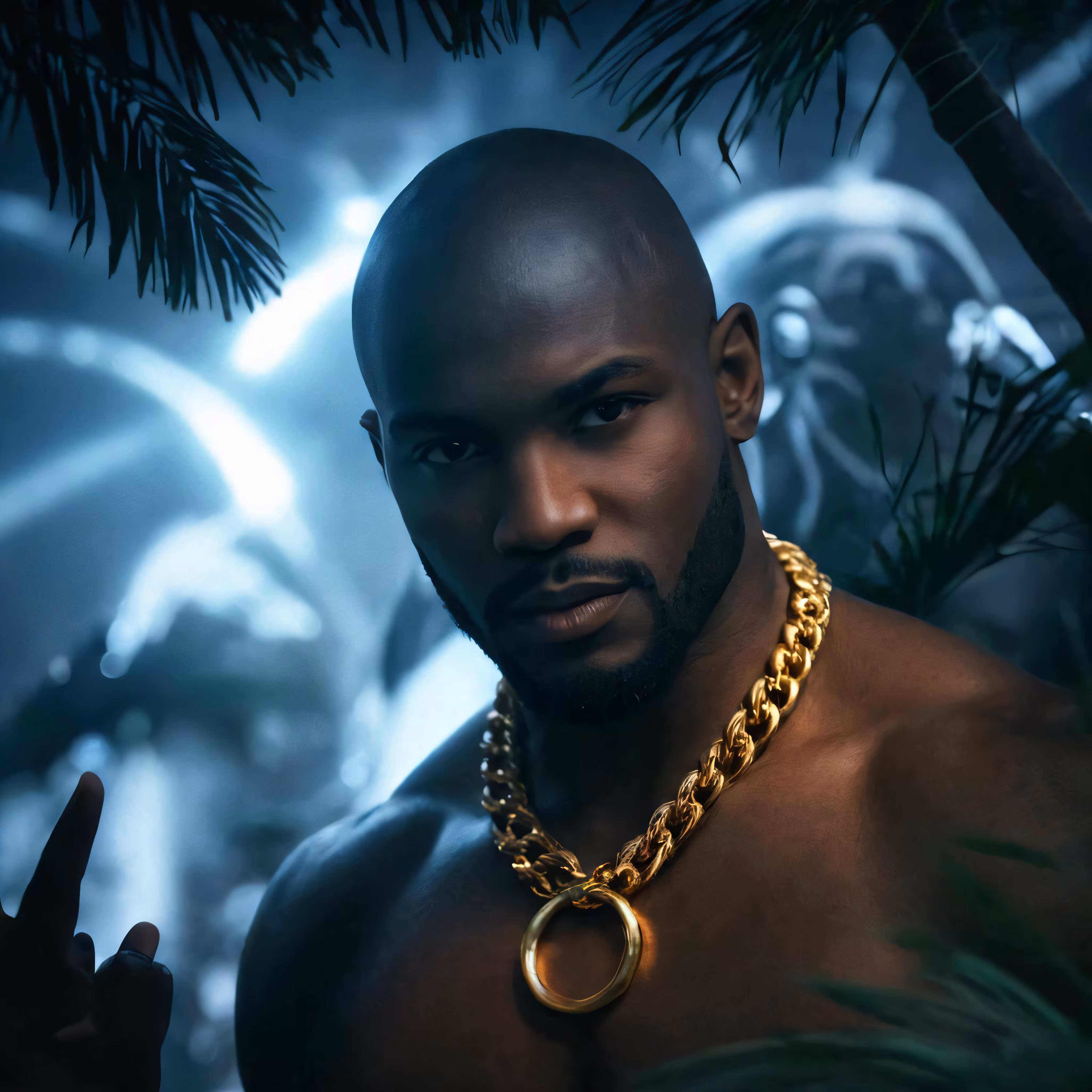 High resolution picture, free to use, a man in the midst of a jungle with his shirt open wearing a gold plated necklace and holding a finger up