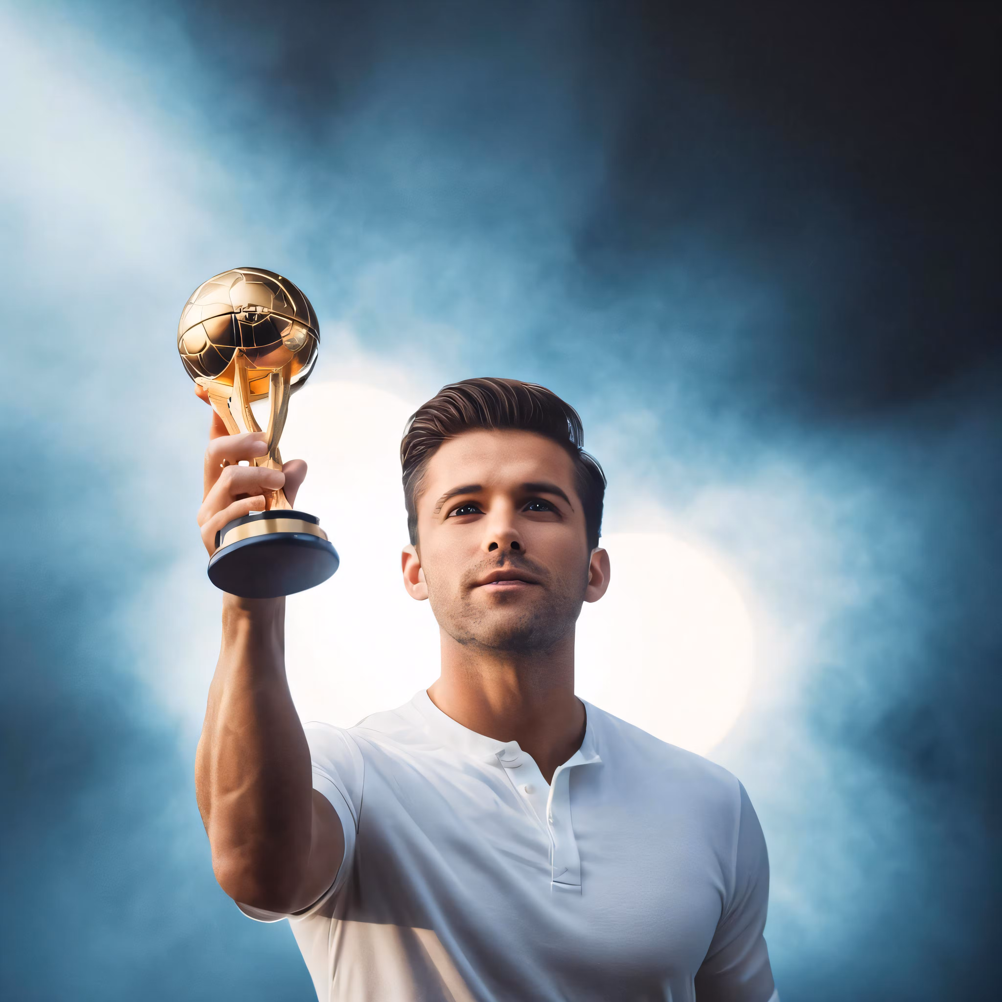 High resolution picture, free to use, a man is holding up a trophy in the dark
